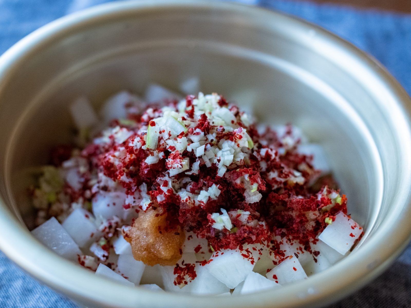 水と昆布で出汁をとり、そこにもち米粉を大さじ1/2入れてのりを作る。中粗挽きの唐辛子、アミの塩辛、カナリエキス(いかなごのエキス)、ニンニクと生姜はみじん切り。ドラマを見ていると、大量のニンニクをがんがん潰して入れているイメージでした。みじん切りにしていれると、きっと味はきれいに入る。調味料ともち米で作ったのり、薬味を混ぜていく。レシピだと松の実が入っていて、材料も用意していたのに、当日入れるのを忘れてしまいました…。夕飯作りと並行してヤンニョムを混ぜていたので、集中力散漫。