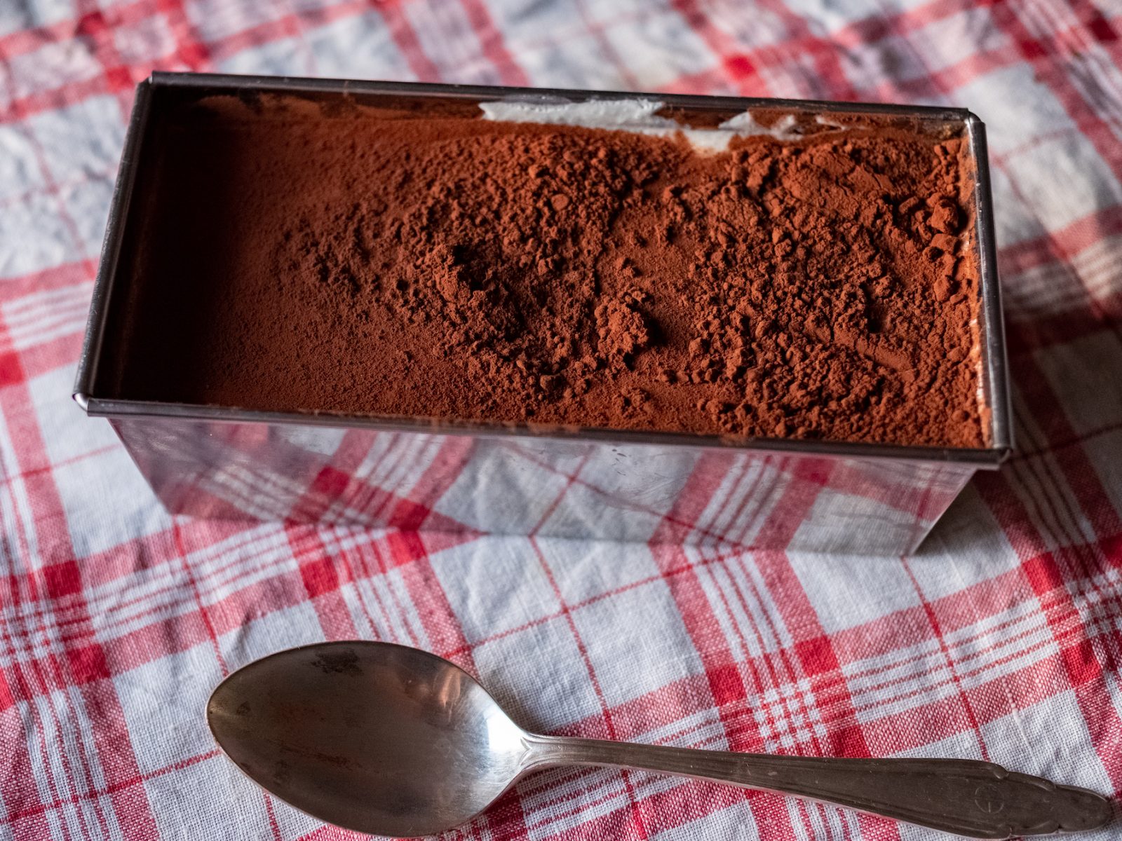 翌日の朝食。ティラミス、しっかり冷えてるよ。ココアパウダーをかけて試食。