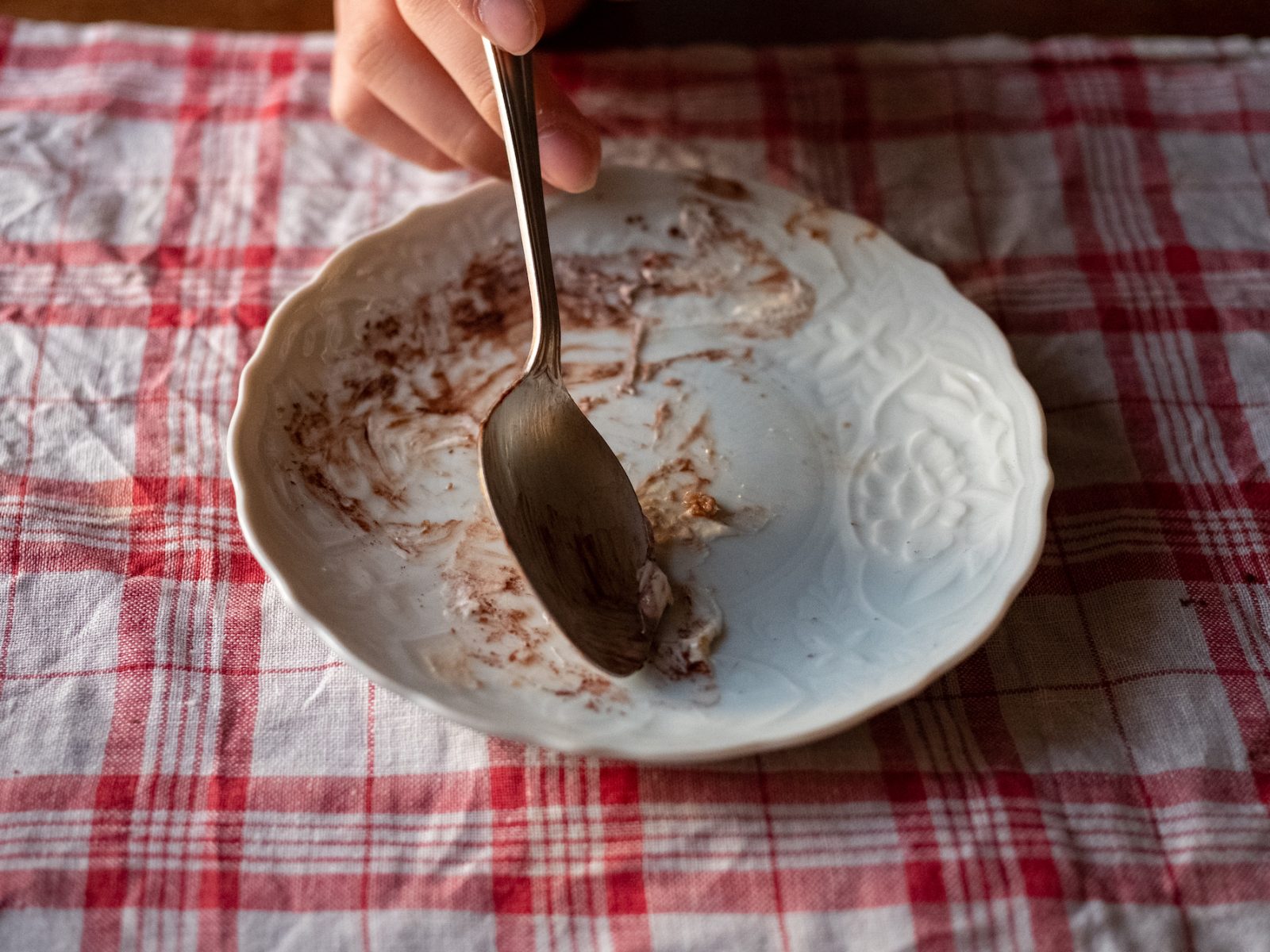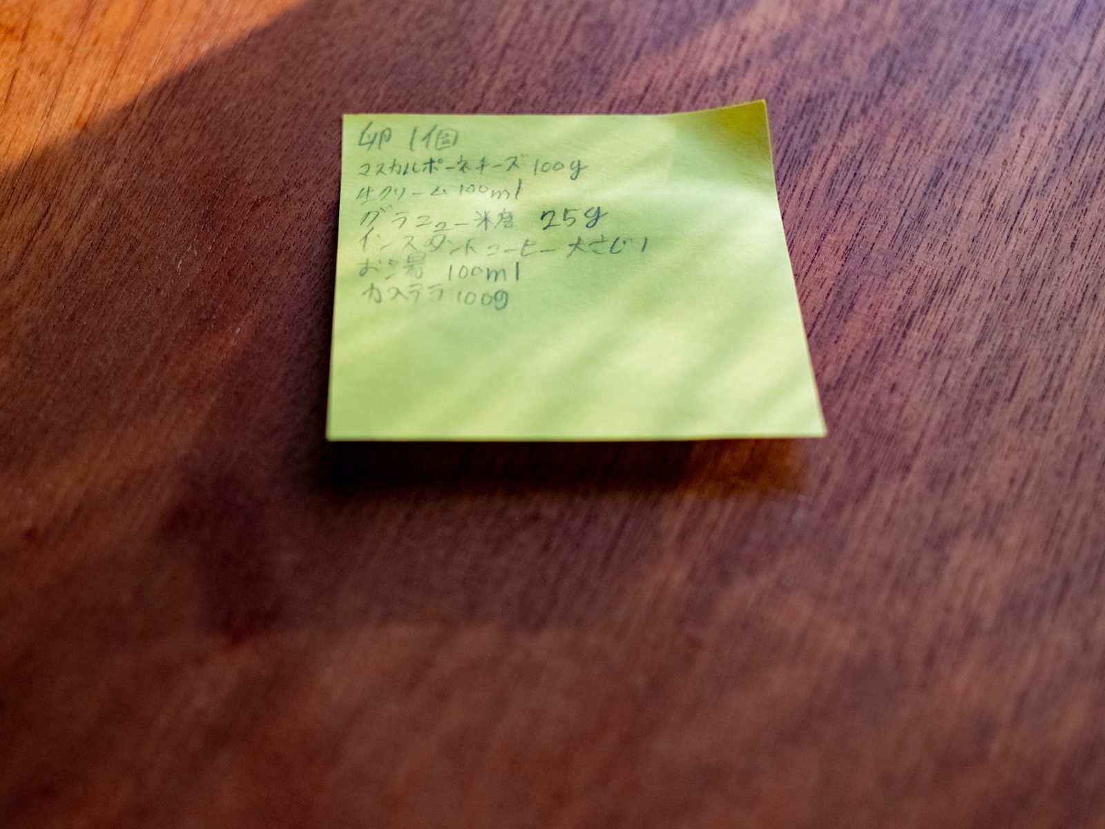 数日後。こどもが何をつくるのかを楽しみに。おいしいティラミスをもう一口。1/2の分量を書き出したメモは、母のレシピ帳に貼りました。