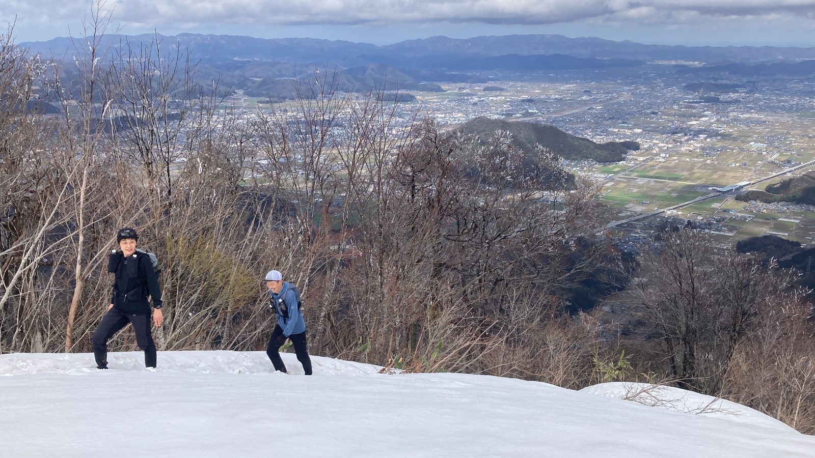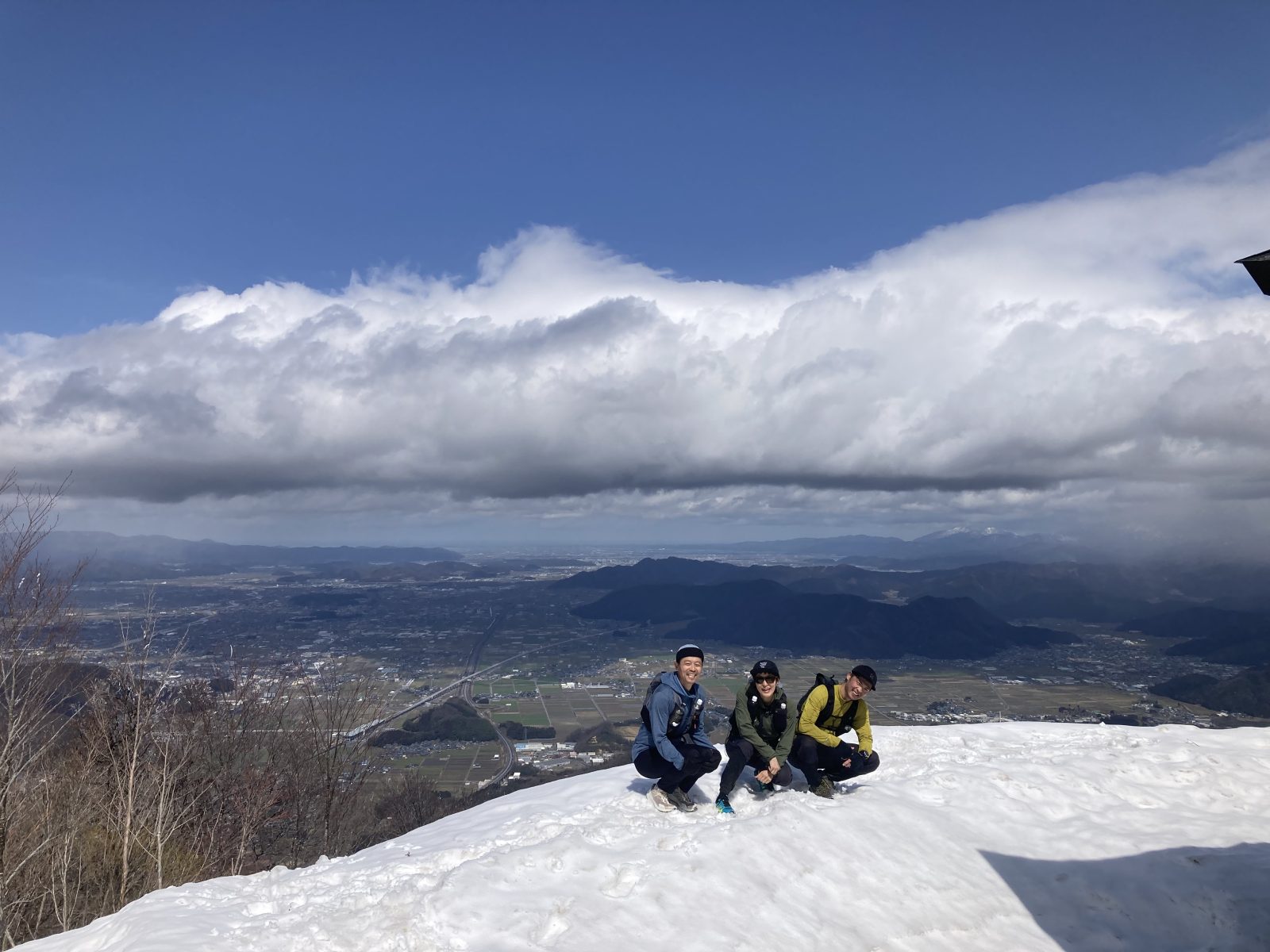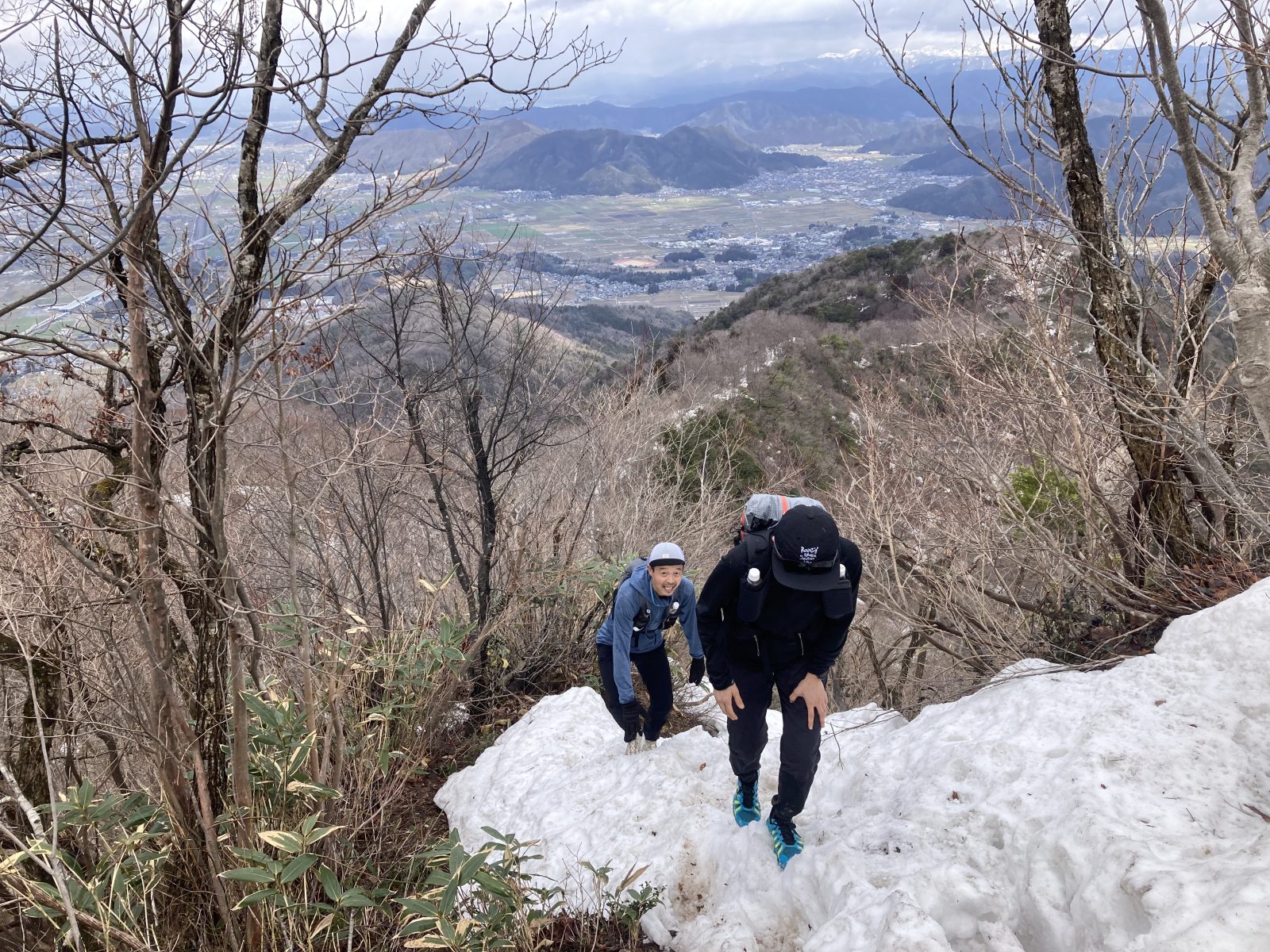 すっかり九州での暮らしに慣れてしまい、北陸の春を忘れていました。標高の低い山といえども、まだ雪が残っています。溶けかけで滑ったり、踏み抜いたり。普通に登るよりも難度が上がります。た、楽しい。
