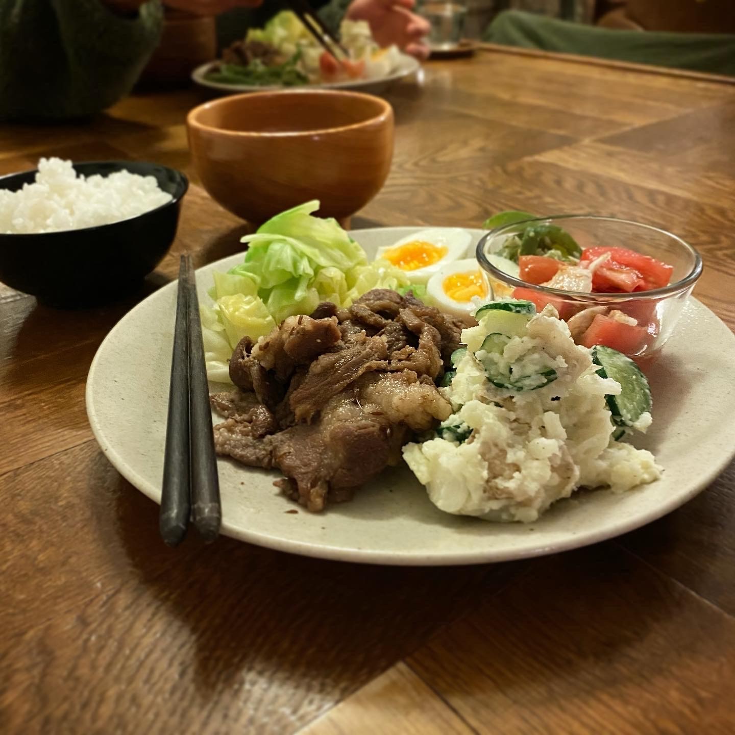 ラム肉のクミン炒め、新じゃがのポテトサラダ(胡瓜、新玉葱)、茹で卵、茹でキャベツ、トマトと新玉葱の甘酢和え、しらすとピーマンの炒め煮(昨日の)、味噌汁(昨日の)、白ごはん