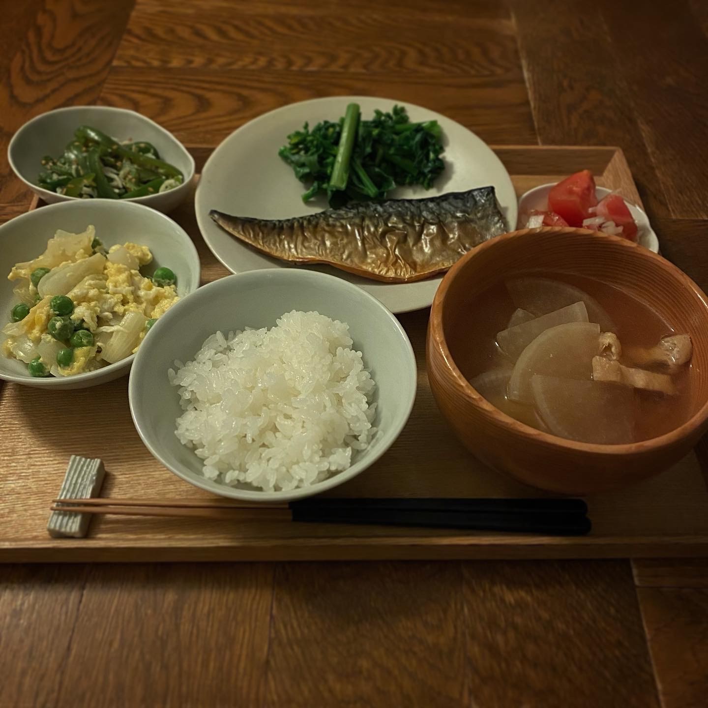 鯖の干物、えんどう豆と新玉葱の卵とじ、しらすとピーマンの炒め煮、のらぼう菜のお浸し(昨日の)、味噌汁(大根、油揚げ)、白ごはん