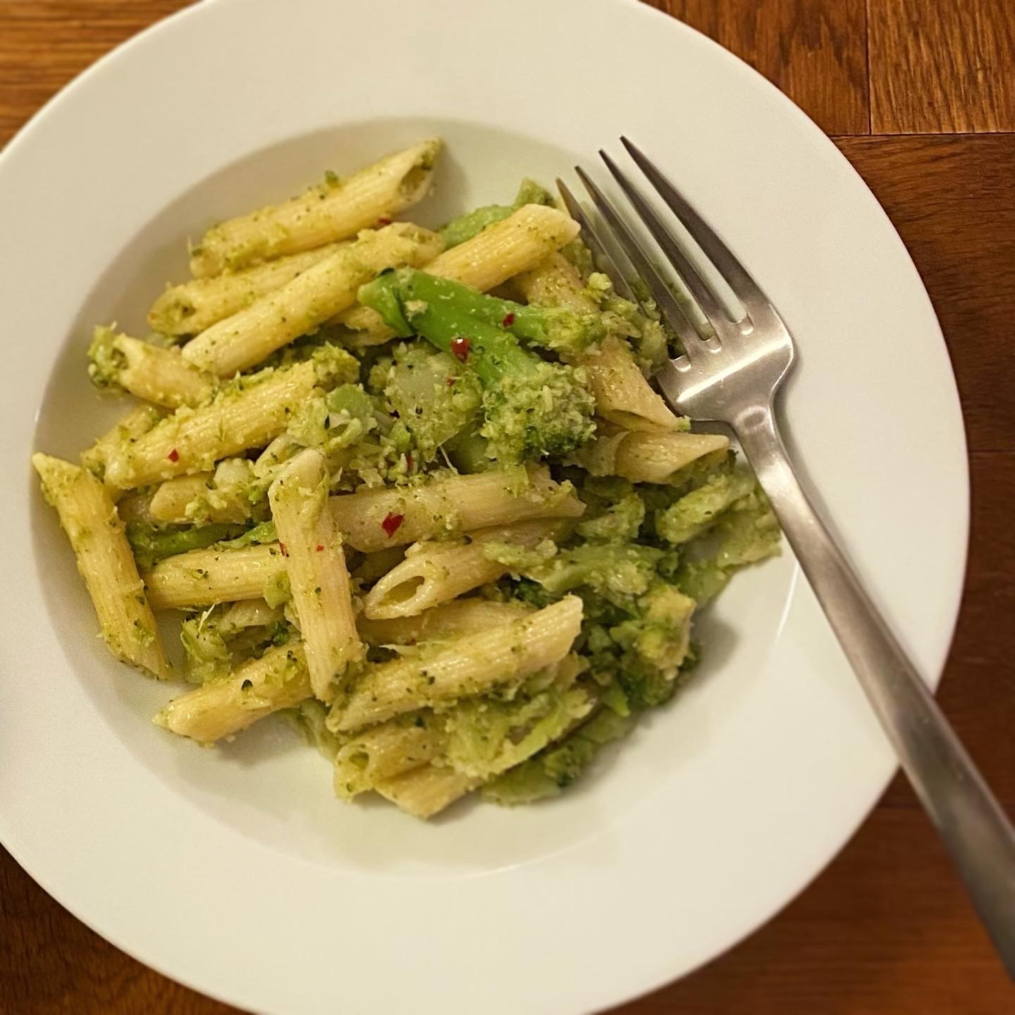 ブロッコリーとアンチョビのペンネ、ポテトサラダ(昨日のにソーセージ追加)、トマトと新玉葱の甘酢和え