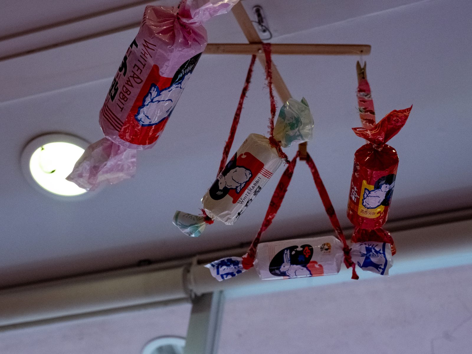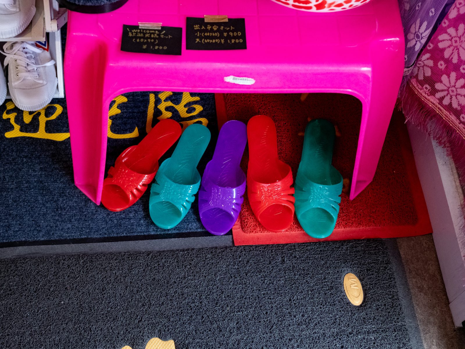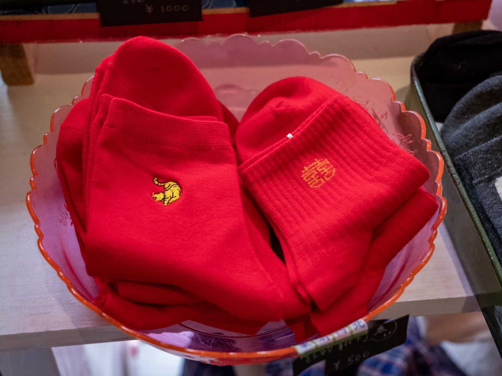虎の刺繍が入った真っ赤な靴下、調味料や塩胡椒を入れるのにぴったりな豆皿。鶏の描かれたメラミン製の茶碗とレンゲ。赤、紫、緑のビニール製のサンダル。「こういうの、もう中国でも探すの難しいですよね。どういう場所で見つけらるんですか?私も昔、中国に留学してたんです。」