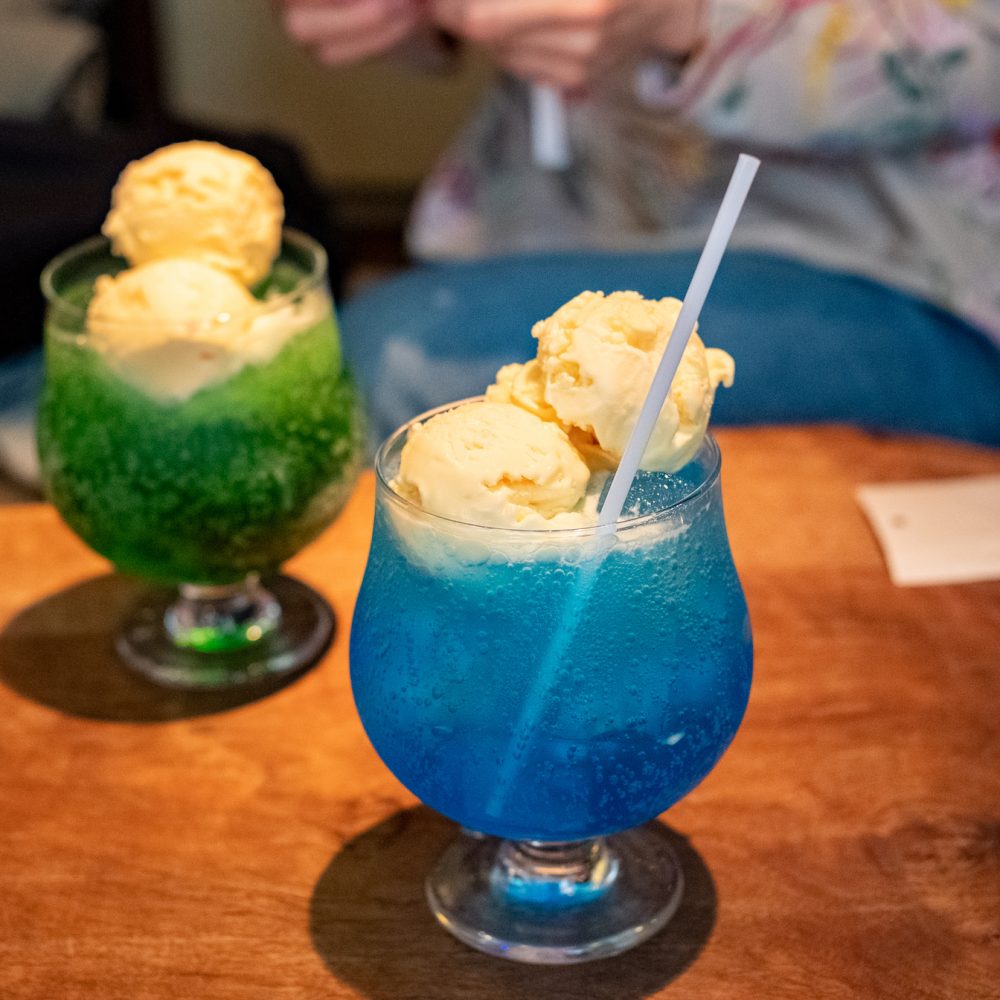 玉子サラダ、レタスとキャベツのサラダがお皿の半分を占める名物のナポリタンにも心惹かれながら、ランチには早い時間なので今日は飲み物で。ここに来たら必ず頼むと決めていたソーダ水を注文。プラス150円で追加できるアイスクリームももちろんトッピング。「わたしもソーダ水にしようかな。どっちの色にする?」わたしはブルーハワイで。じゃあ、わたしはメロンにする。