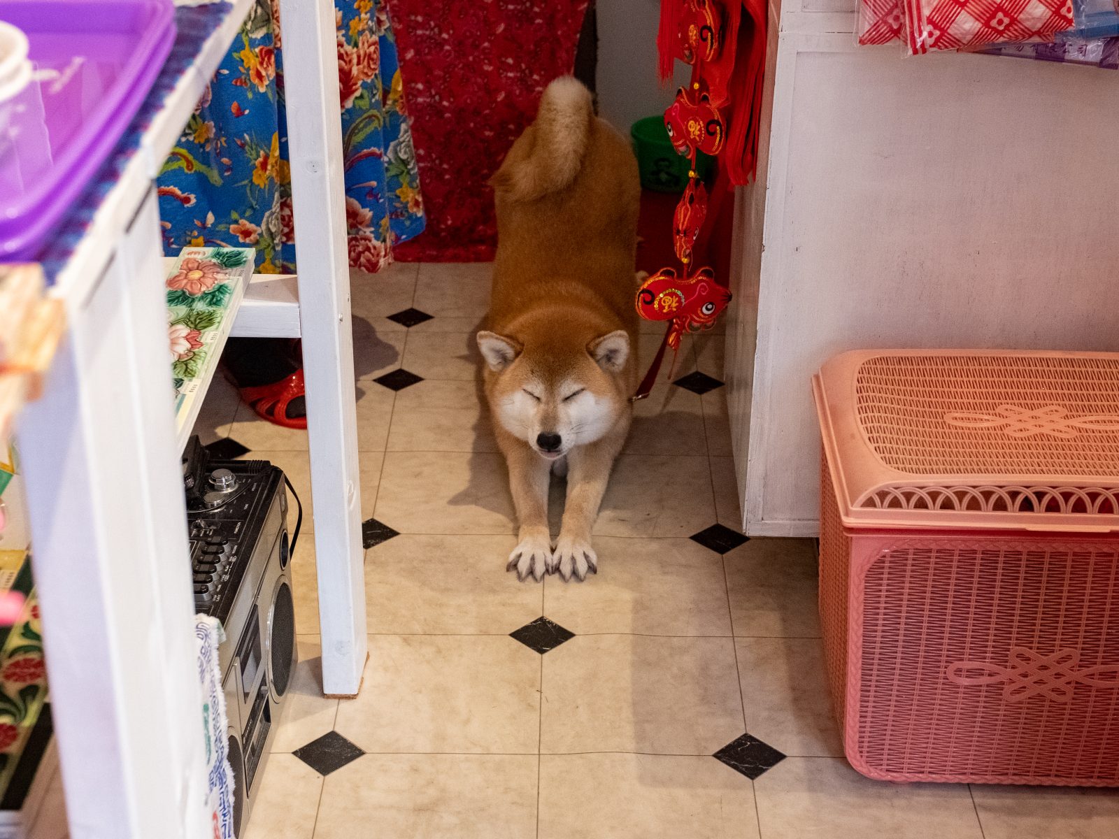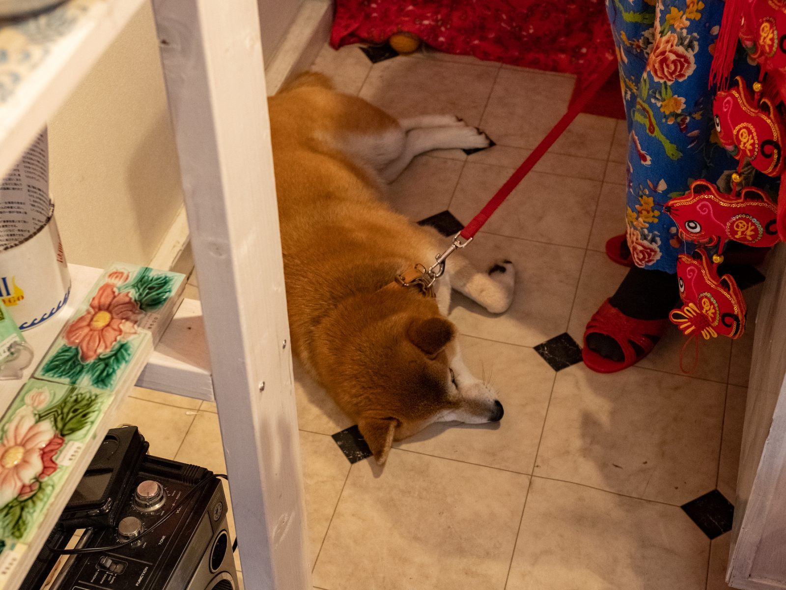 「あきなっていうんです。おはよう。」お店の看板犬、あきなちゃんが睡眠からお目覚め。うーんと伸びをしてゆっくりこちらに目線をくれます。おっとりしたあきなちゃんとしばし戯れる間も、ニホンコン先生と店主の方のチャイナトークが続く。