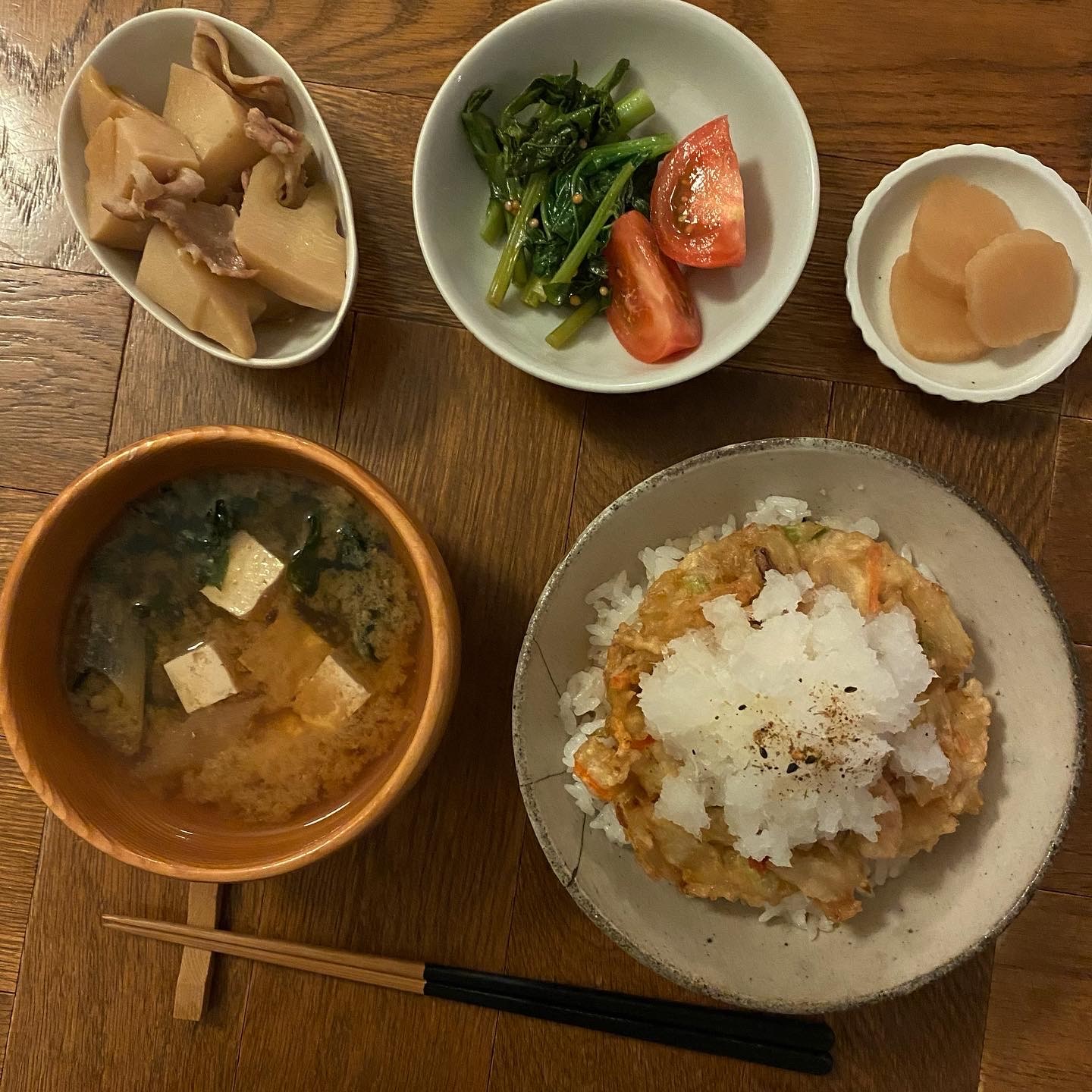 かき揚げ丼(大根おろし)、筍の煮物(昨日の)、かき菜のお浸し(昨日の)、トマト、味噌汁(昨日の)、たくあん