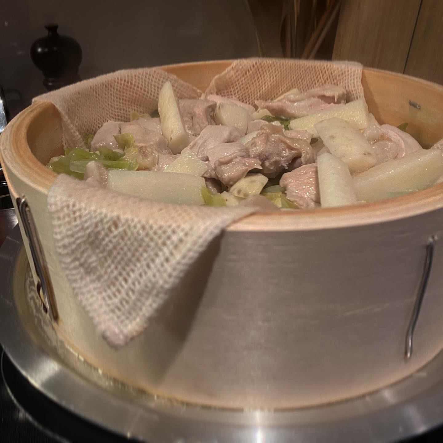 鶏むね肉と春キャベツと長芋のせいろ蒸し、長葱と卵の炒め物、キャロットラペ、トマト、味噌汁(新玉葱、新じゃが芋、わかめ)、白ごはん
