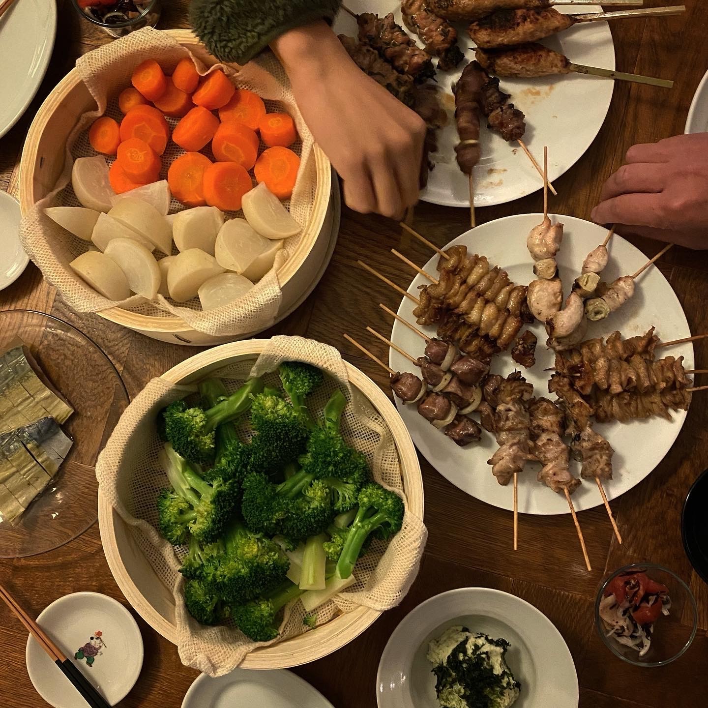 帰りがすっかり遅くなってしまったので、焼き鳥を夫に買ってきてもらい、しめ鯖切って、せいろでたっぷり蒸し野菜。