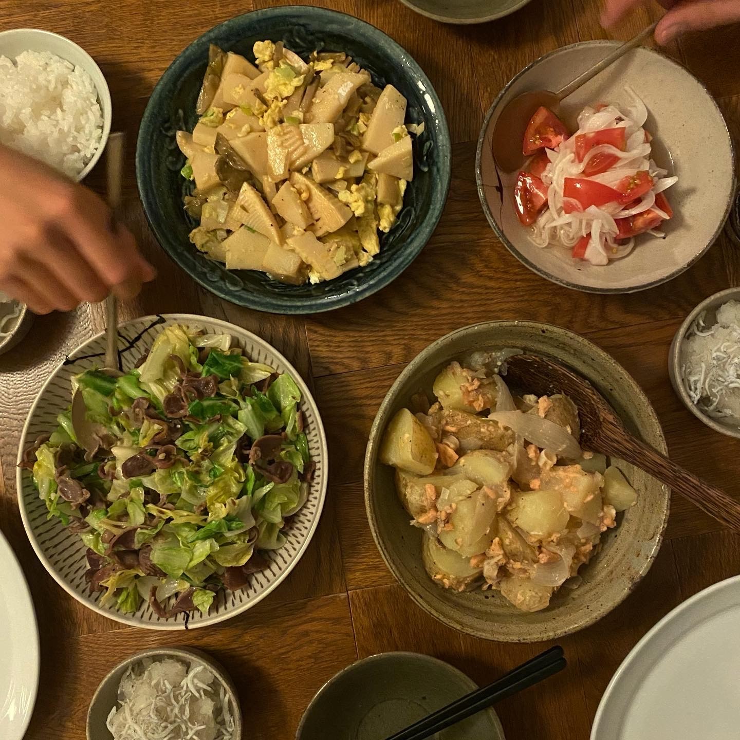 砂肝とキャベツのクミン炒め、筍と搾菜と卵の炒め物、鮭じゃが、トマトと新玉葱のサラダ、しらすおろし、白ごはん