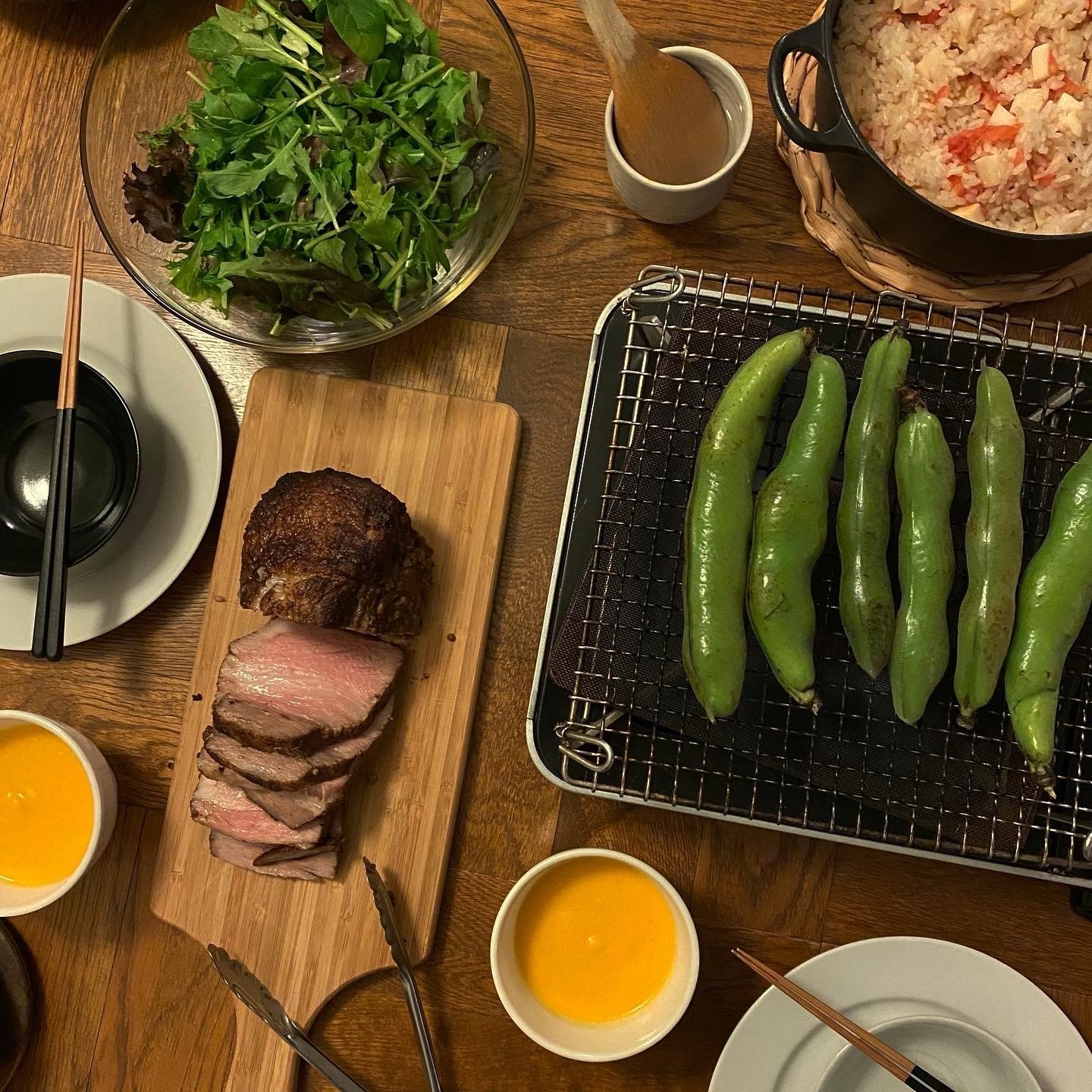 ローストポーク、筍とトマトの炊き込みごはん、空豆の網焼き、人参のポタージュ、葉っぱのサラダ