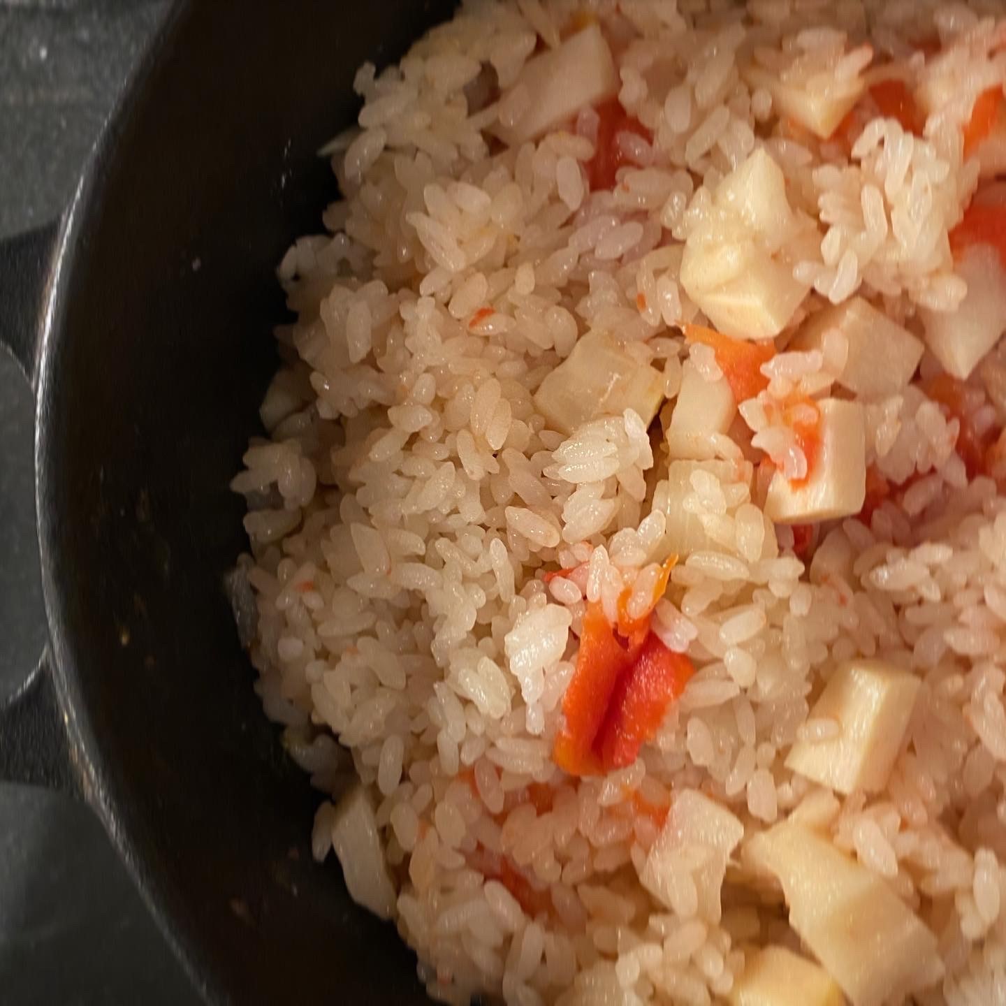 筍はダイス状に切ってトマトと一緒に炊き込みごはんに。和のような洋のような~旨味たっぷりの炊き込みごはんは夫に大好評。