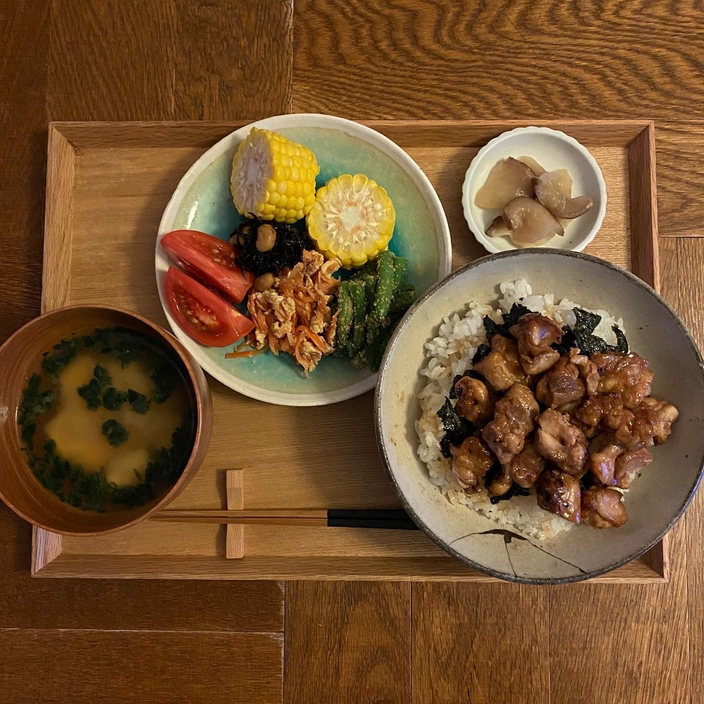 焼き鳥丼、残りものおかずいろいろ、いぶりがっこ、味噌汁(豆腐、あおさ)