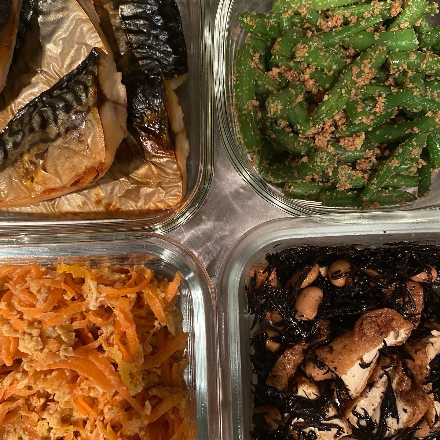 焼鯖、人参シリシリ、いんげん胡麻和え、ひじきと厚揚げの煮物、トマト、味噌汁(昨日の)、白ごはん