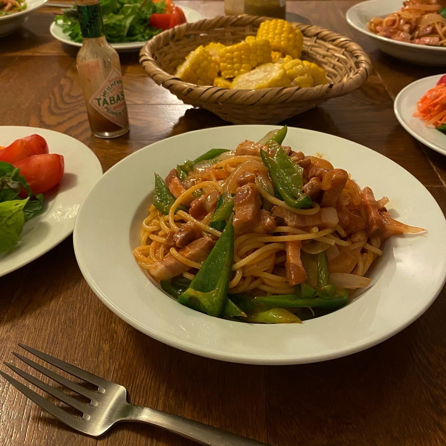 ナポリタンスパゲティー、キャロットラペ、葉っぱのサラダ、トマト、茹でもろこし
