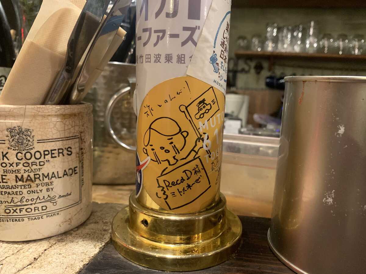 そして、小林オーナーからプレゼントが!↑写真のムトーツアーズステッカーが貼ってあるビールサーバーの向かいのカウンター席に座って「ムトーツアーズ見ました。マスター、じゃんけんしてください。」と言うと、小林さんがじゃんけん3本勝負をしてくれます。3連勝したらムトーがいつも注文するムトーのわがままパスタ「ミトメネーゼ」を1皿ご馳走してくださるそうです。