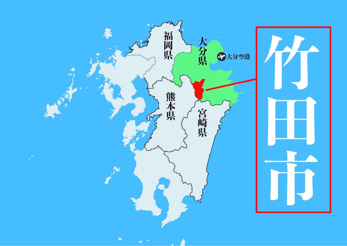 竹田と書いて「たけた」と読みます。「たけだ」じゃなく。人口は約2万人。熊本県の阿蘇と隣接している内陸の街です。大分空港からは車で2時間弱。熊本空港からだと1時間30分かからないくらいの位置です。