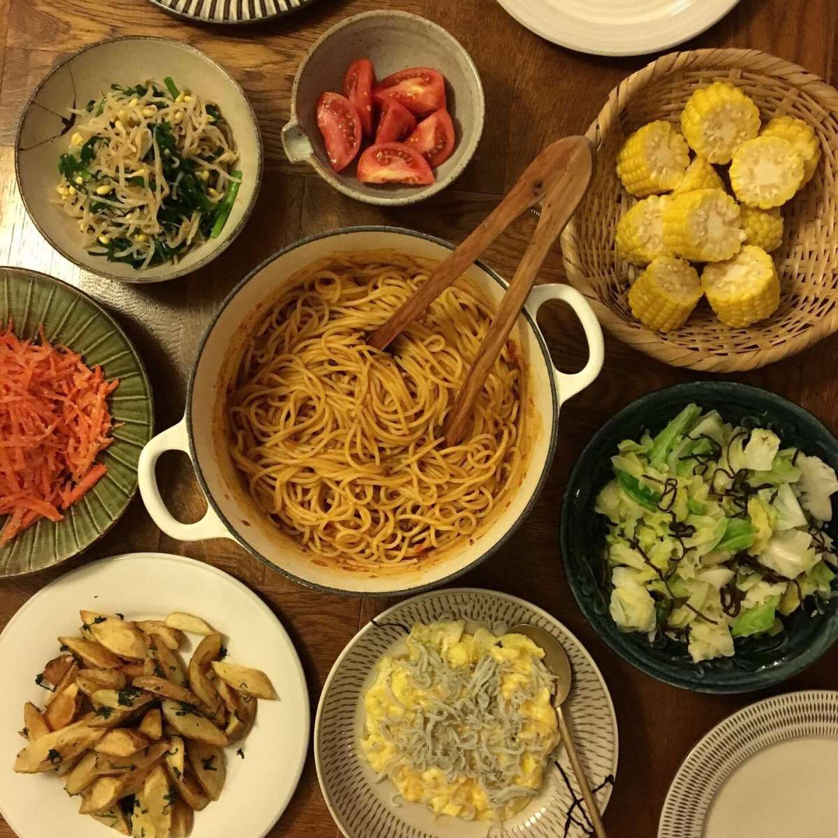 その他、モヤシとニラのナムルに、トマト(切っただけ)、とうもろこし(茹でただけ)、キャベツと塩昆布の和え物(茹でて和えただけ)、たらこ人参(和えてチンしただけ)、青じそ風味のポテト(揚げただけ)、しらすのオムレツ(焼いてのっけただけ)