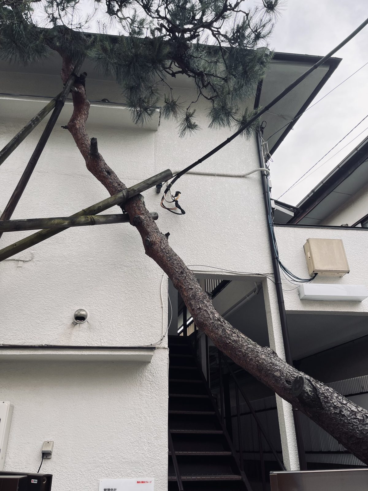 写真の木は最初、真横に伸びていて、階段を上るにもよいしょっと、と頭を低くさげないと