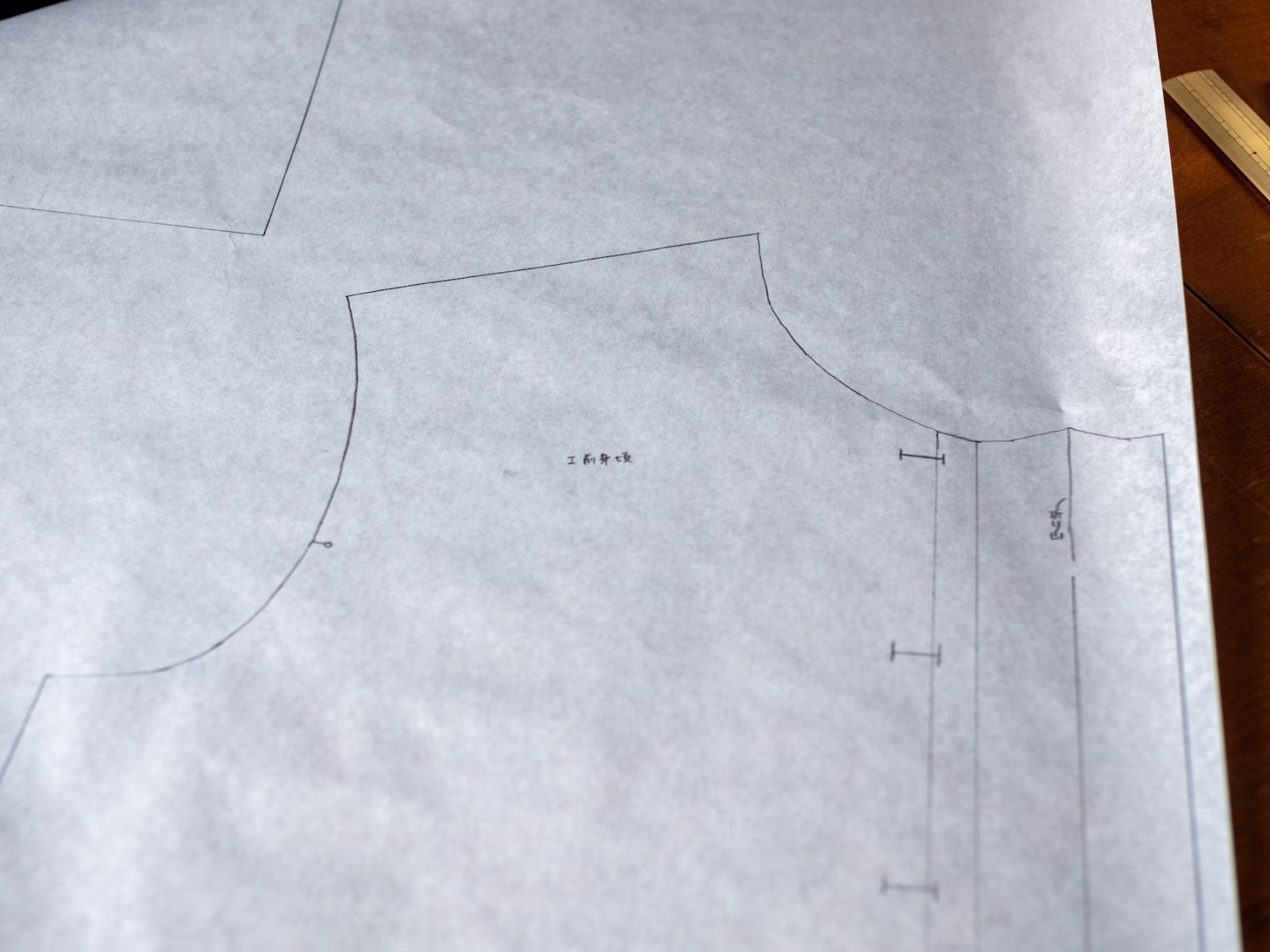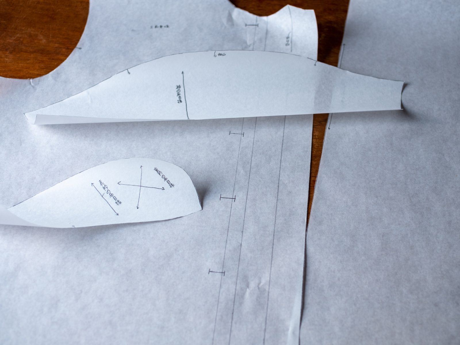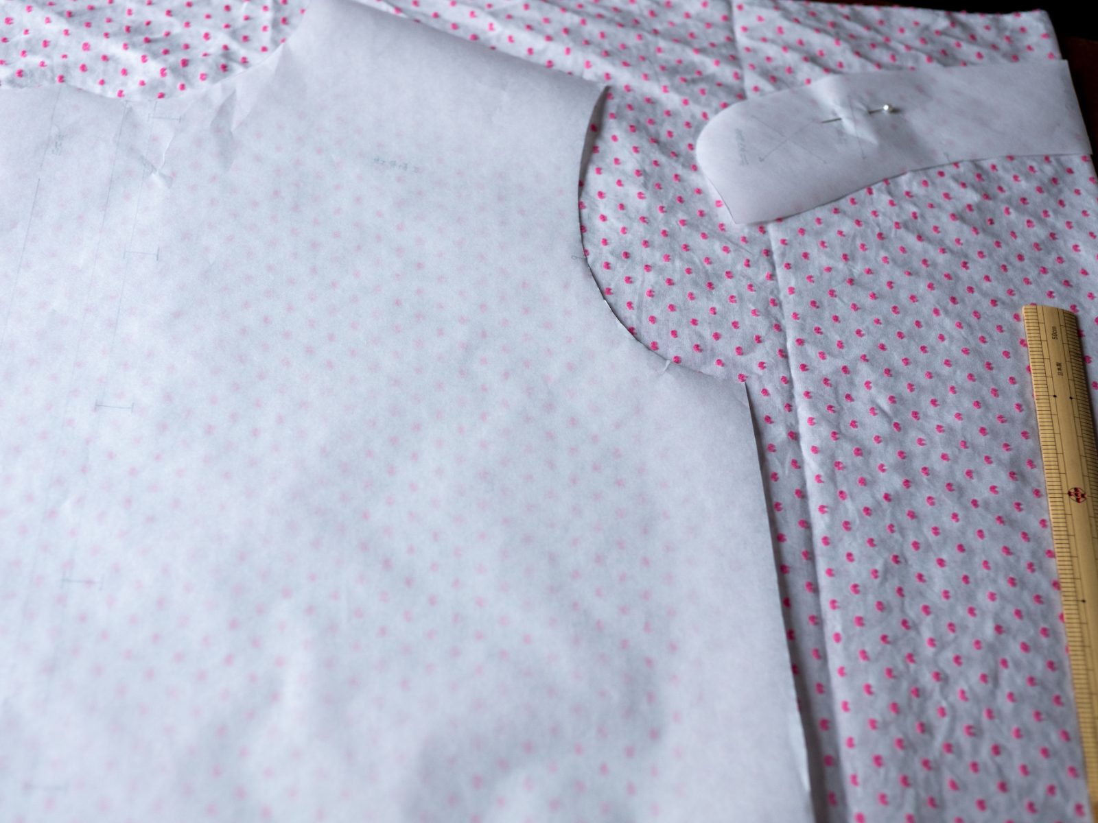 型紙をハトロン紙に写して、布をカット。この夏使い勝手の良さそうな、軽いブラウスが近日できる予定。