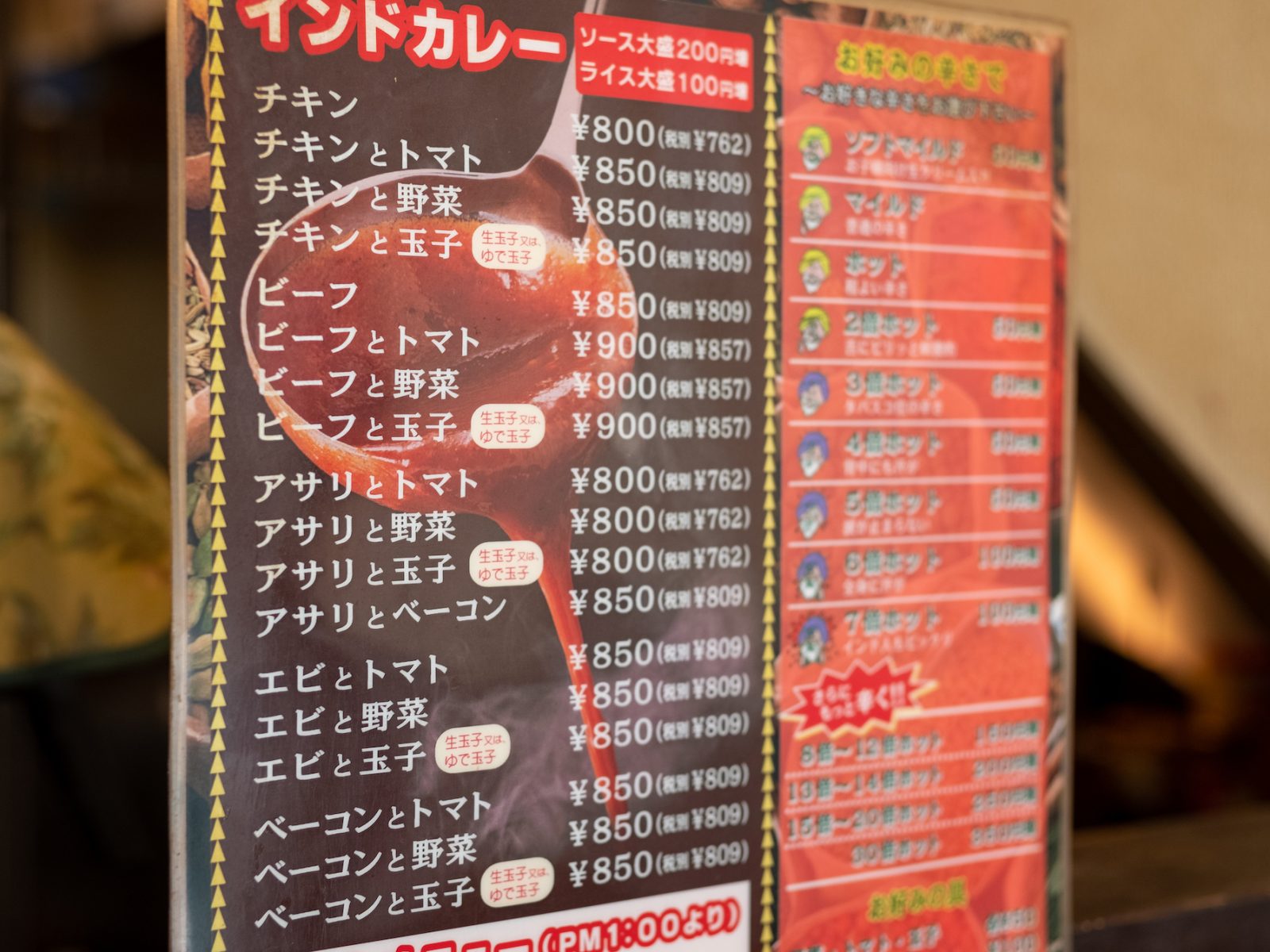 アサリアサリエビ。アサリアサリエビ。呪文のように海産物を唱えながらメニューをもう一度見る。アサリとトマト、アサリと野菜、アサリと玉子、アサリとベーコン。どこを見てもアサリとアサリとエビというメニューはない。辛さの説明の下を見てみると「お好みの具」というところにアサリやエビが単独でもトッピングできることが判明した。アサリ増し増しのカレーにエビ。池ちゃんの写真に写るカレーには、いつもこれでもかというくらいアサリが乗っている。