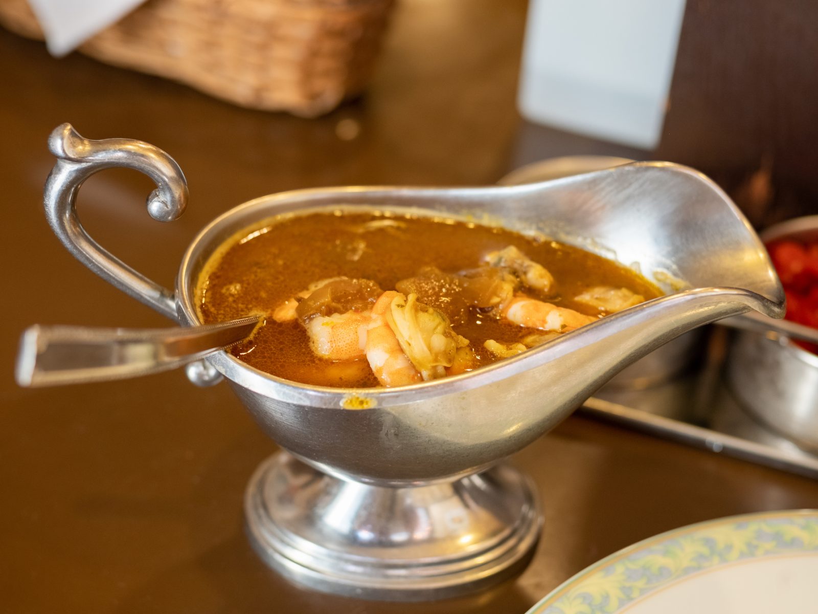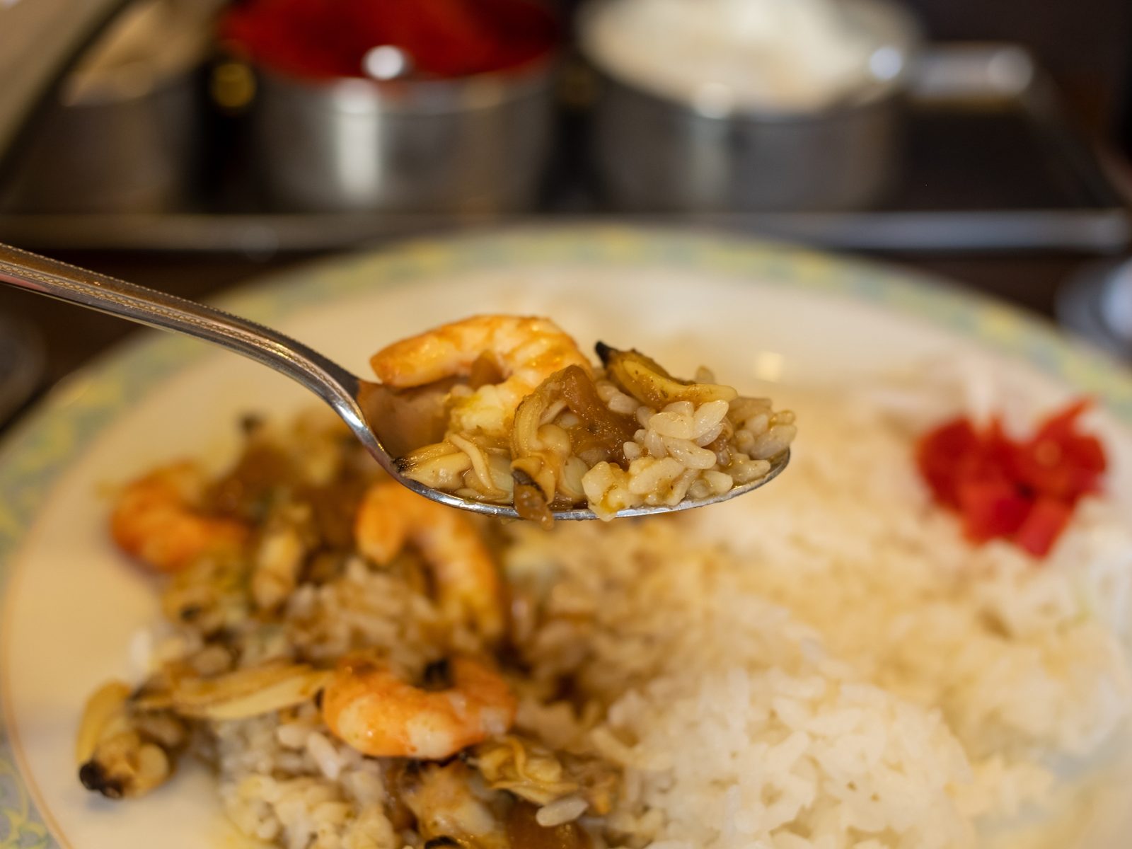 池ちゃんマジックでエビをおまけしてもらった魔法のカレーポットがやってきた。エビとアサリがソースから飛び出る量。