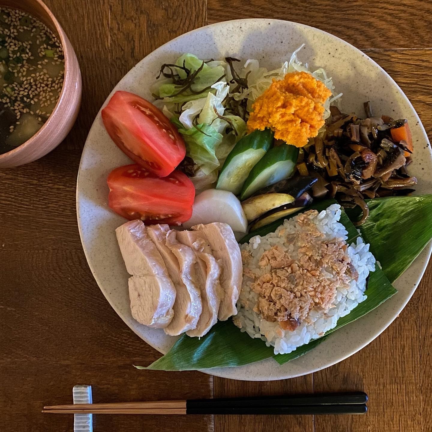 蒸し鶏、笹寿司、ぜんまいの五目煮、そうめん南瓜(人参ドレッシング)、茹でキャベツの塩昆布和え、トマト、ぬか漬け、炒め茄子と豆腐のみそ汁(葱、胡麻、生姜)