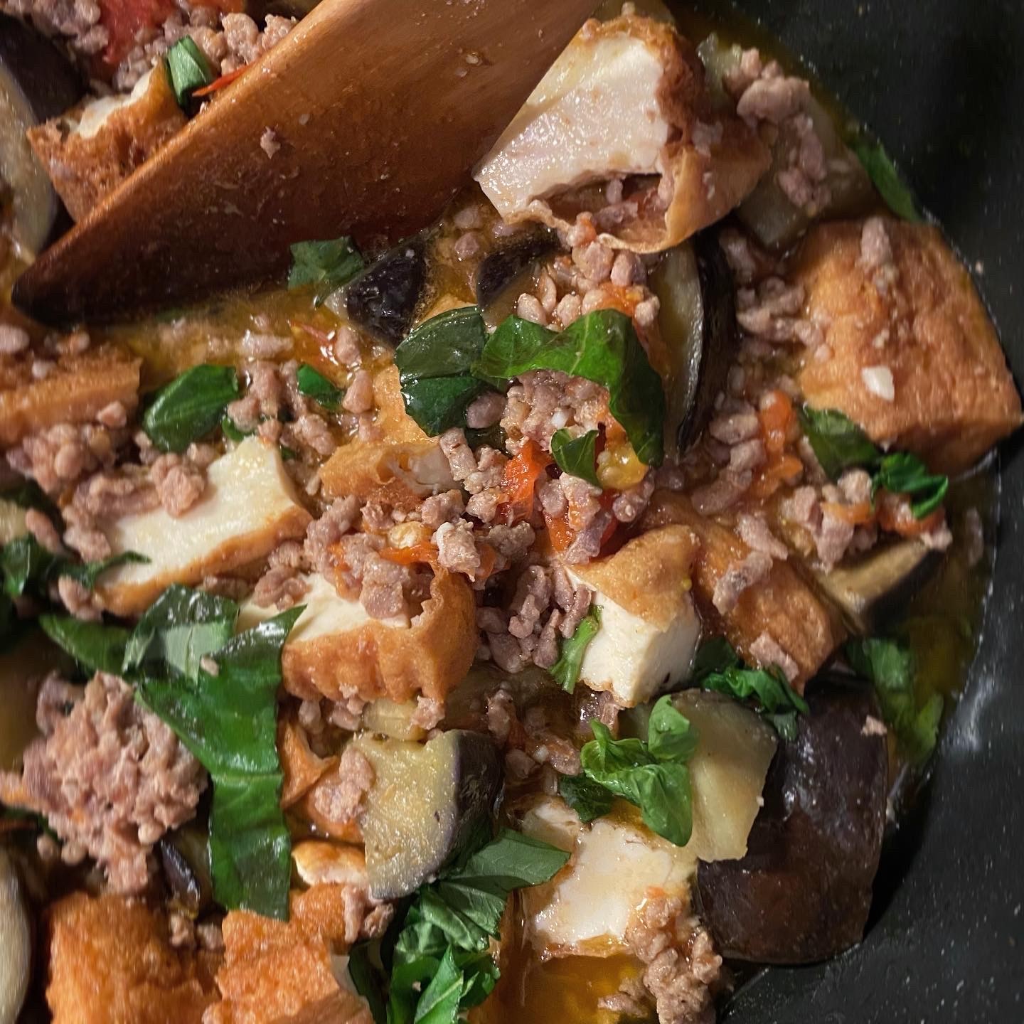 厚揚げと茄子と豚ひき肉のベトナム風煮込みのっけごはん、茹でオクラの塩昆布和え、大根スープ
