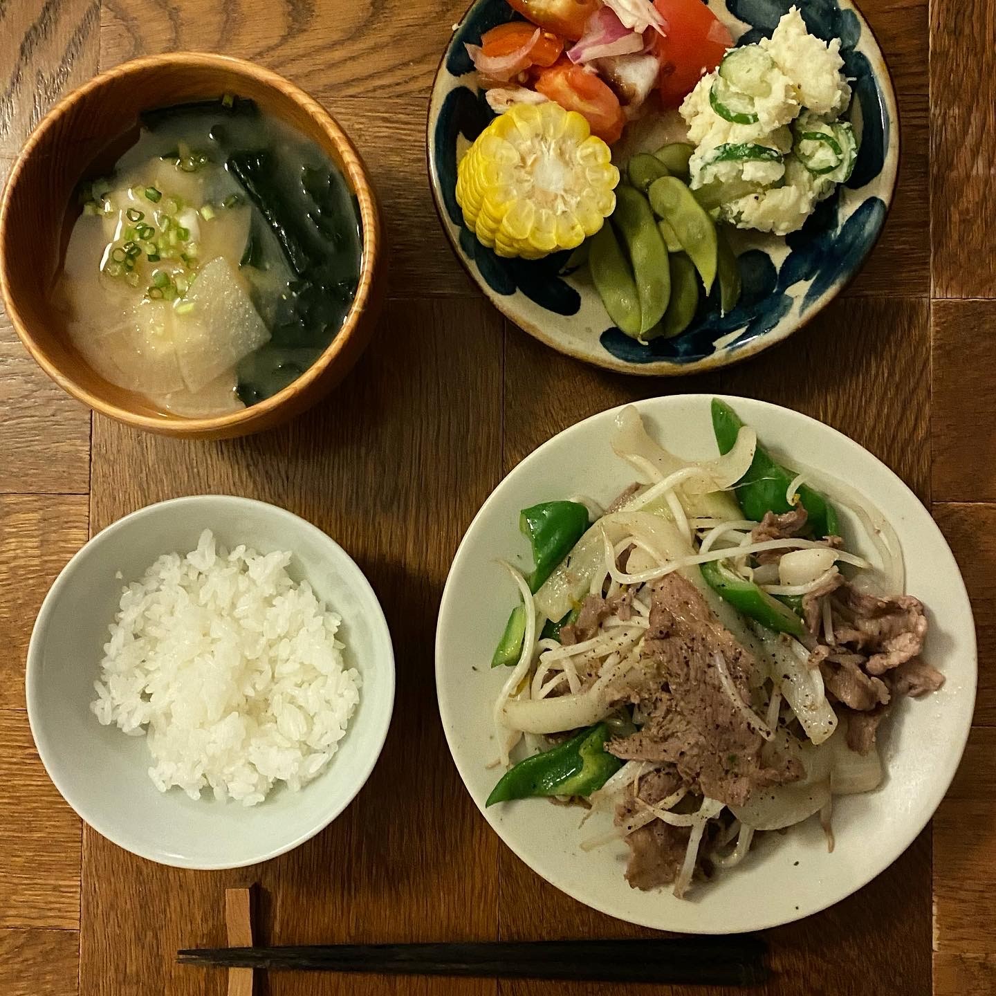 ジンギスカン、ポテトサラダ(胡瓜)、茹でもろこし、トマトと赤玉葱の甘酢漬け、みそ汁(豆腐、ワカメ、葱)、白ごはん