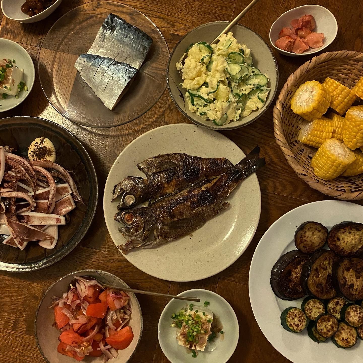 クロムツの塩こうじ漬け、イカの一夜干し、しめ鯖、丸茄子とズッキーニのソテー、ポテトサラダ(胡瓜)、茹でもろこし、トマトと赤玉葱の甘酢漬け、冷奴、落花生の醤油煮、明太子、白ごはん