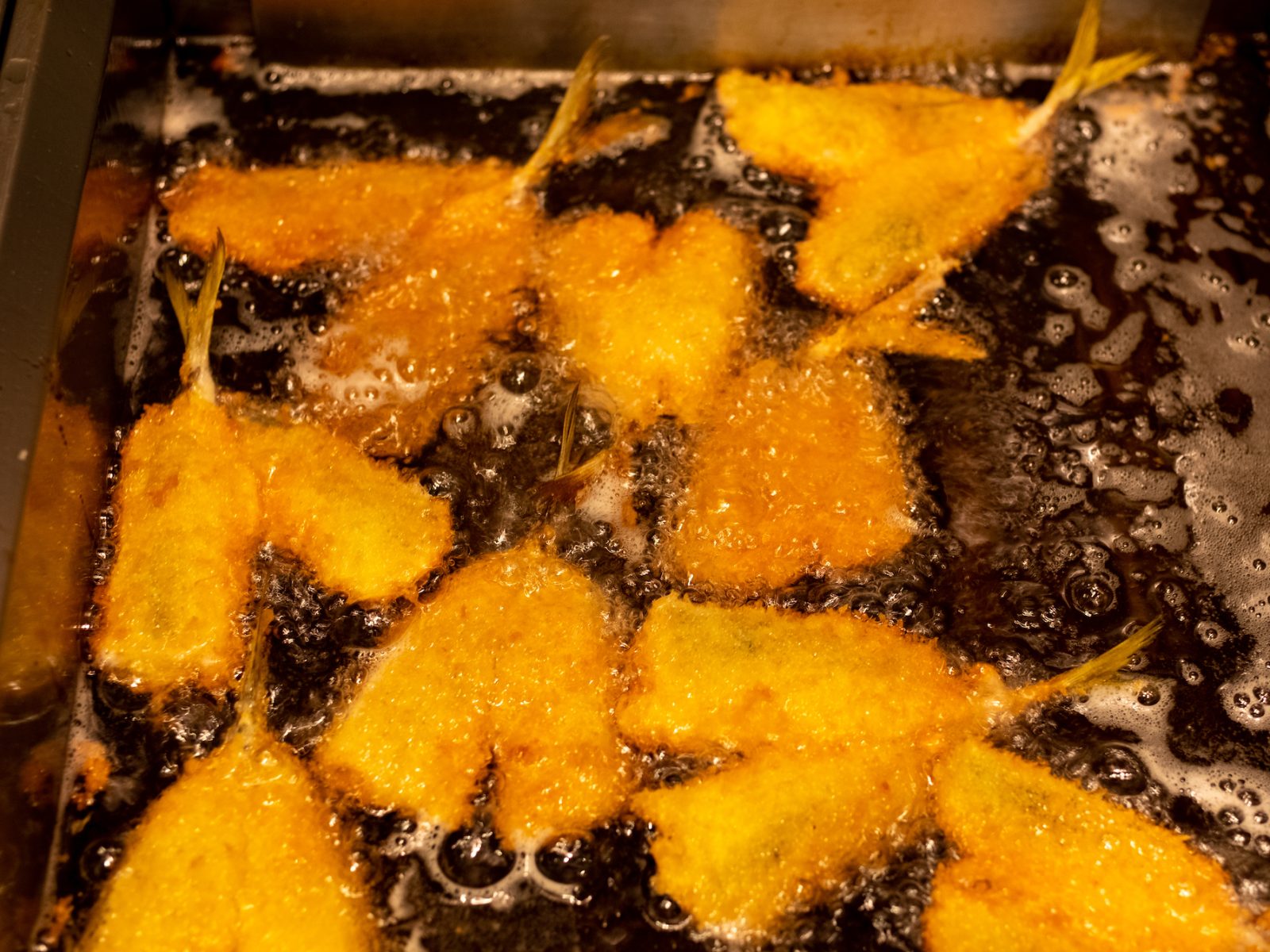 干物も刺身もおいしい鯵。でも「鯵+フライ」になった時に、やっぱり一番お腹が減る。フライは海外から入ってきたものだよね。また江戸時代にワープ。この頃の日本の揚げ物といえば天ぷらが主流。大量の油を使って素材を揚げる「ディープ・ファット・フライング」を用いるのが日本の揚げ物の特徴。それに対して、西洋では少量の油で揚げる「シャロウ・ファット・フライング」がメインの揚げ方だった。体のことを気にすると「少なめの油で」とも一瞬思ってしまうけれど、やっぱり大量の油でカラッと揚げる方がおいしく感じてしまう揚げ物大好き人間です。