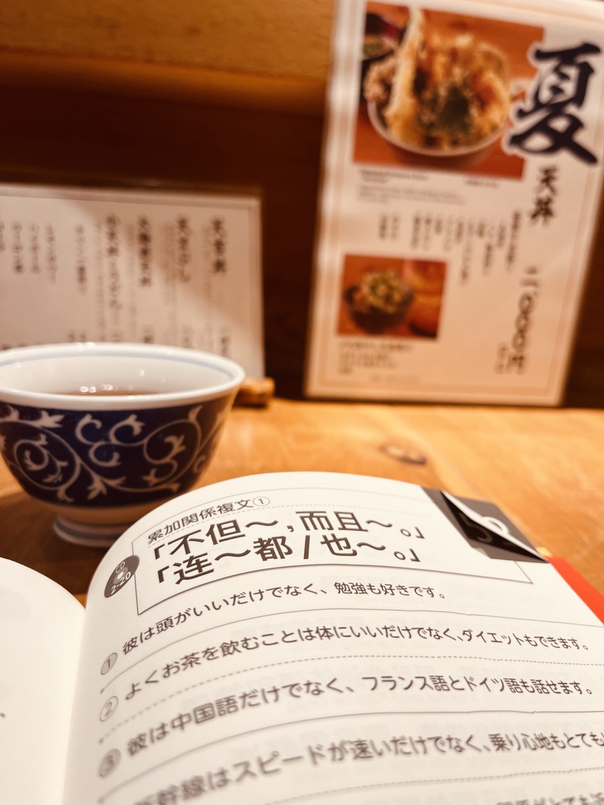 お昼に天丼を待ってるときも勉強してます。