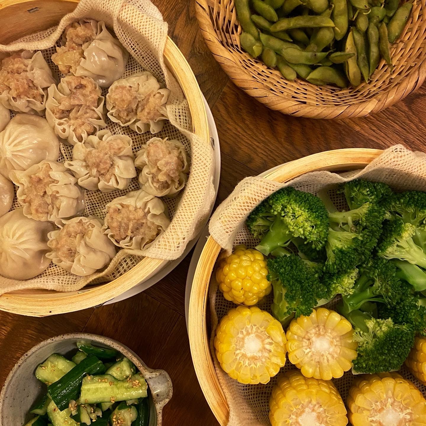 セイロ蒸し(冷凍焼売、冷凍小籠包、とうもろこし、ブロッコリー)、枝豆、叩き胡瓜、トマト、肉じゃが(昨日の)、白ごはん