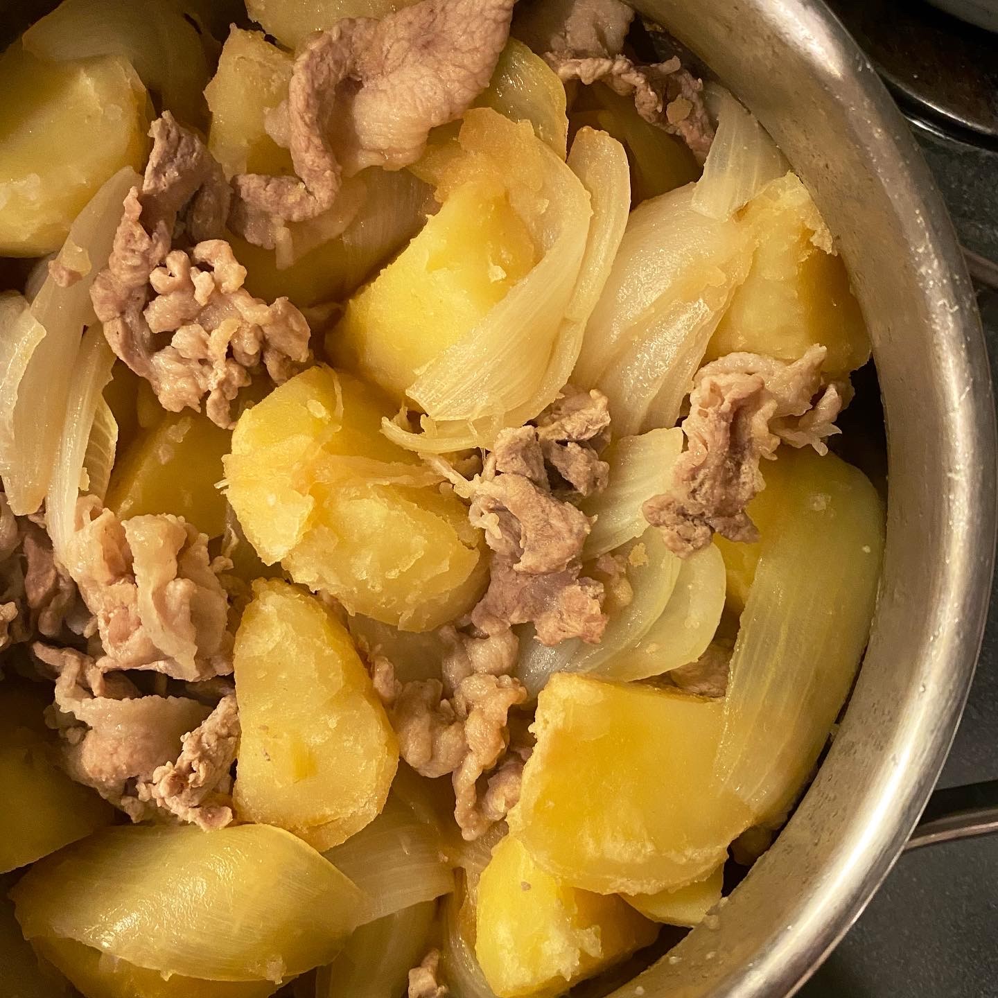 鰺の開き、肉じゃが、ワカメと小松菜のナムル、みそ汁(昨日の)、白ごはん