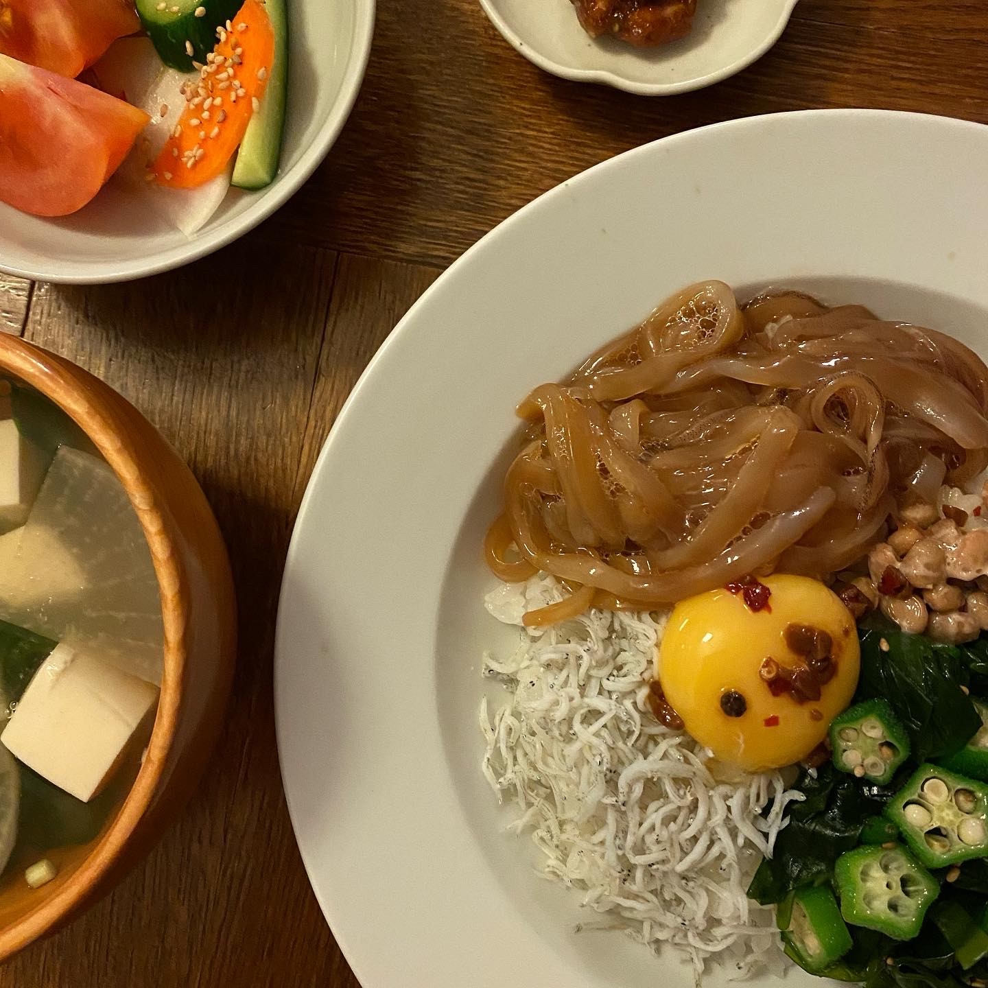 のっけ丼(イカの漬け、しらす、ワカメとオクラのナムル、納豆、卵)、水キムチ、トマト、ピーナッツの味噌漬け、みそ汁(豆腐、ワカメ、大根、葱)