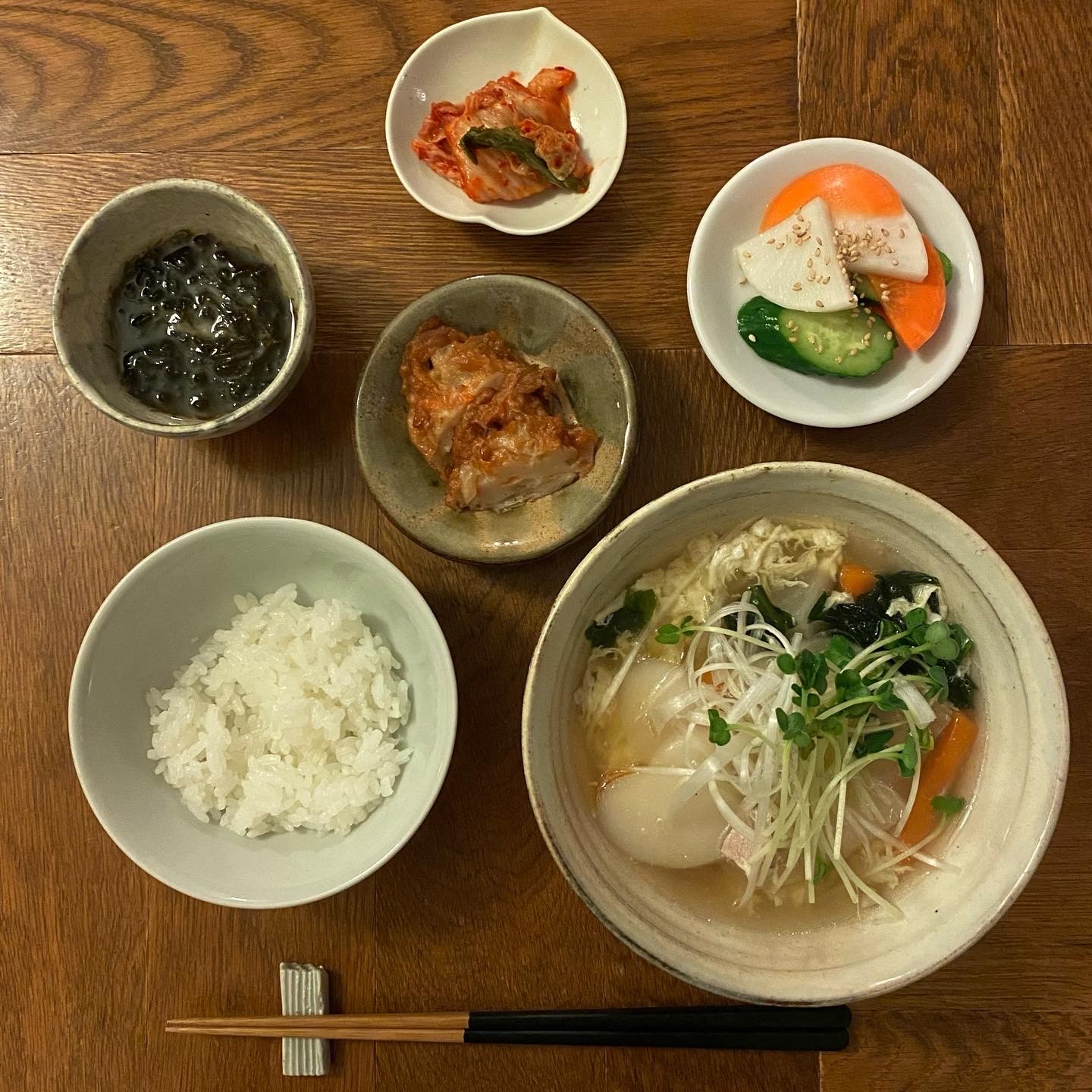 トックスープ(塩豚のゆで汁、豚肉、大根、人参、卵、ワカメ、薬味)、さつま揚げ、もずく酢、水キムチ、キムチ、白ごはん