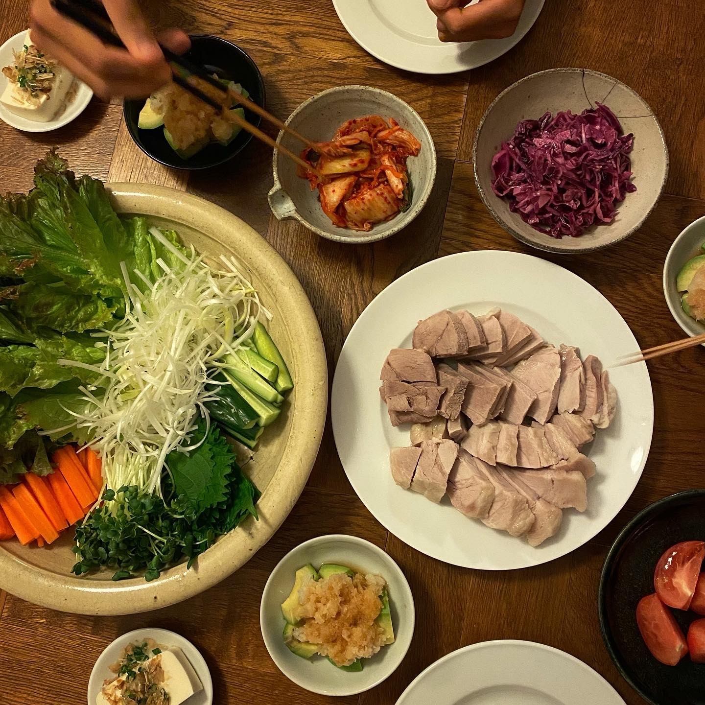 茹で塩豚の野菜巻き、アボカド大根おろし(ポン酢)、紫キャベツのマリネ、冷奴、トマト、キムチ、韓国海苔、白ごはん