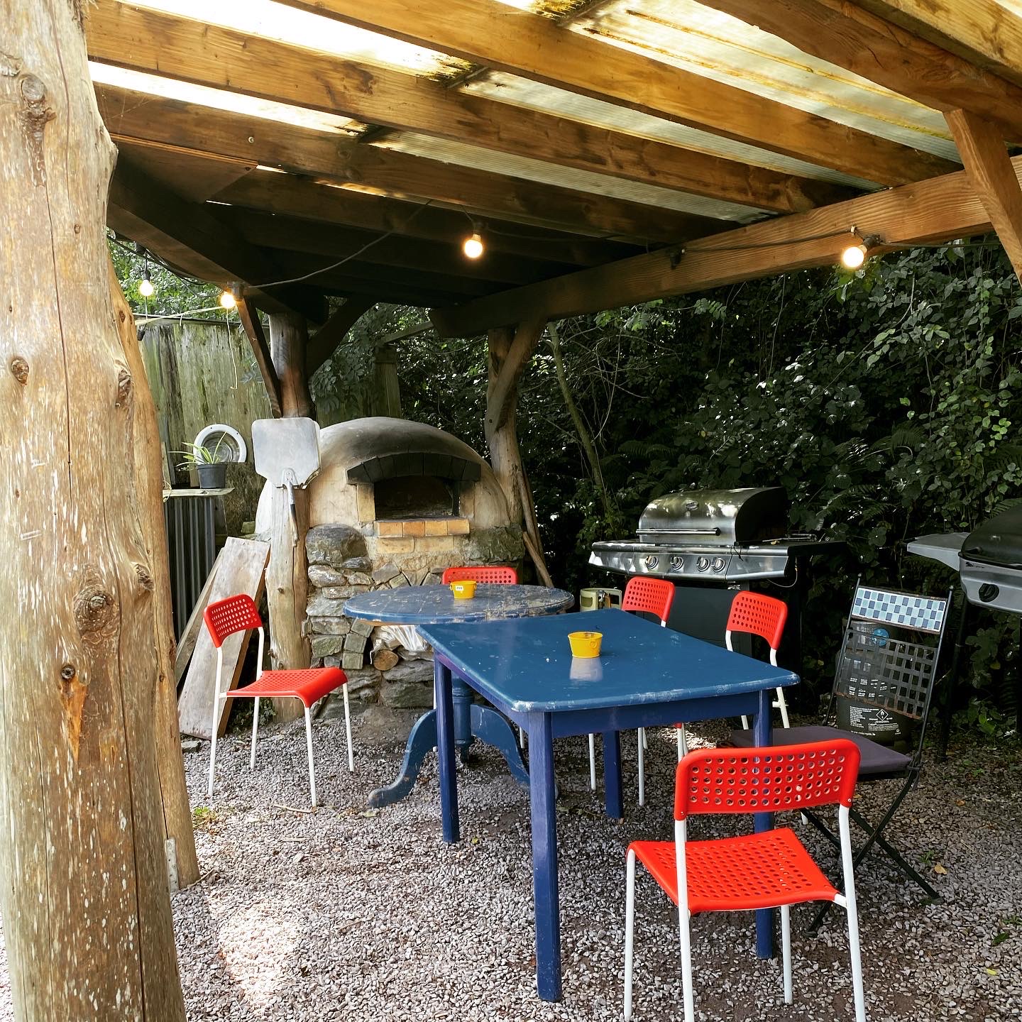共有キッチンや、バーベキュー、ピザ窯、バー。色遣いもかわいらしく雰囲気に統一感がある。