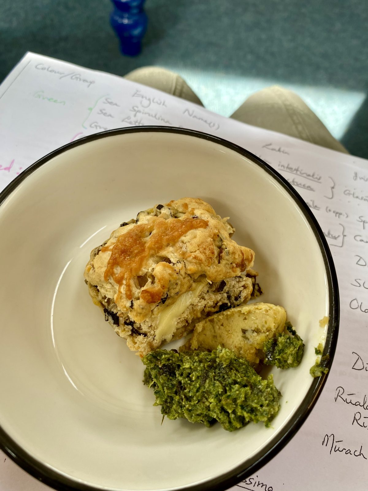 スコーン、クラッカー、海藻いりフムス、ジェノベーゼ、スムージー。