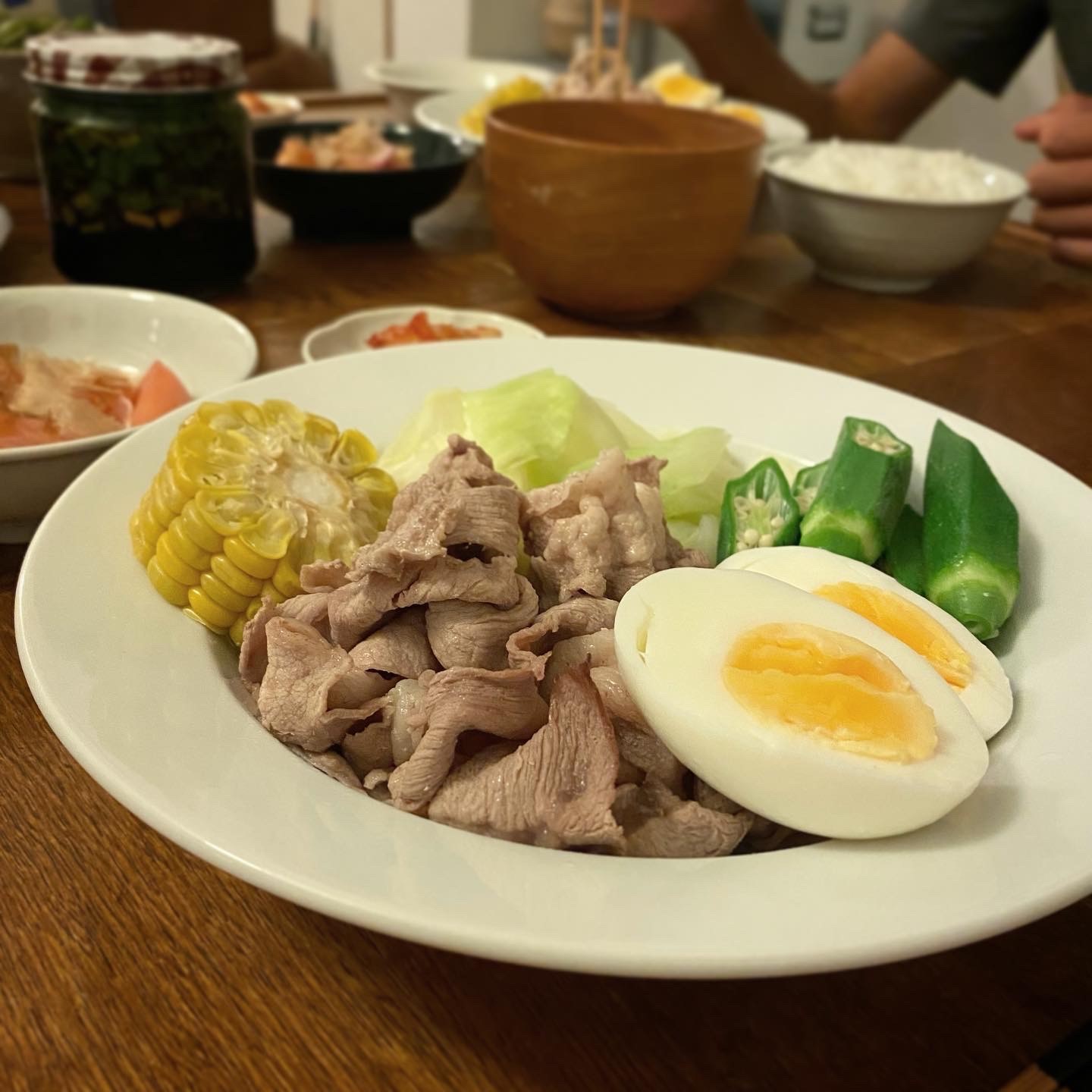 豚しゃぶ(キャベツ、オクラ、茹でもろこし)、トマトと赤玉葱の甘酢漬け、キムチ、みそ汁(豆腐、長葱、ワカメ)、白ごはん