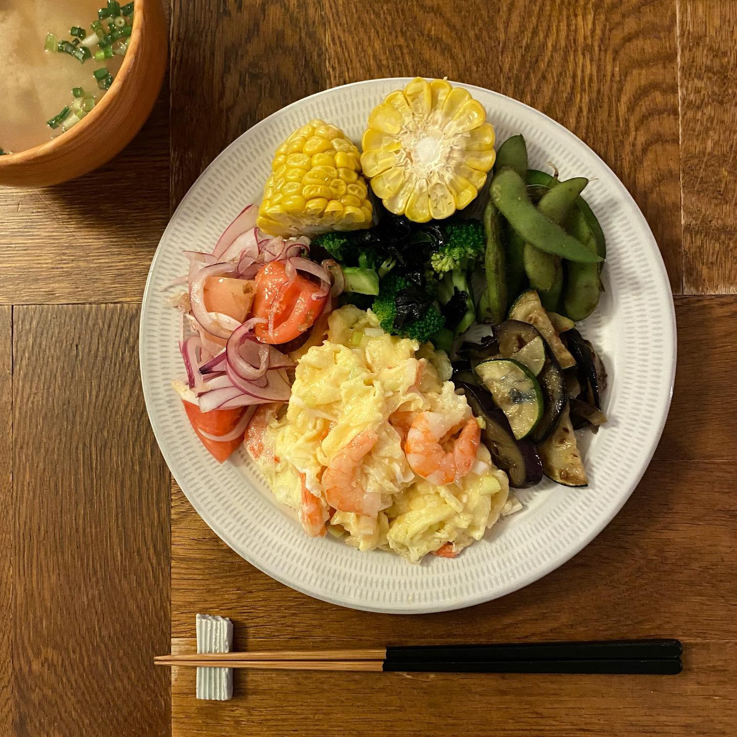 海老と卵の炒め物、茄子とズッキーニのラー油炒め、ブロッコリーと海苔のナムル、トマトと赤玉葱の甘酢漬け、茹でもろこし、枝豆、みそ汁(大根、油揚げ、ワカメ、葱)、白ごはん