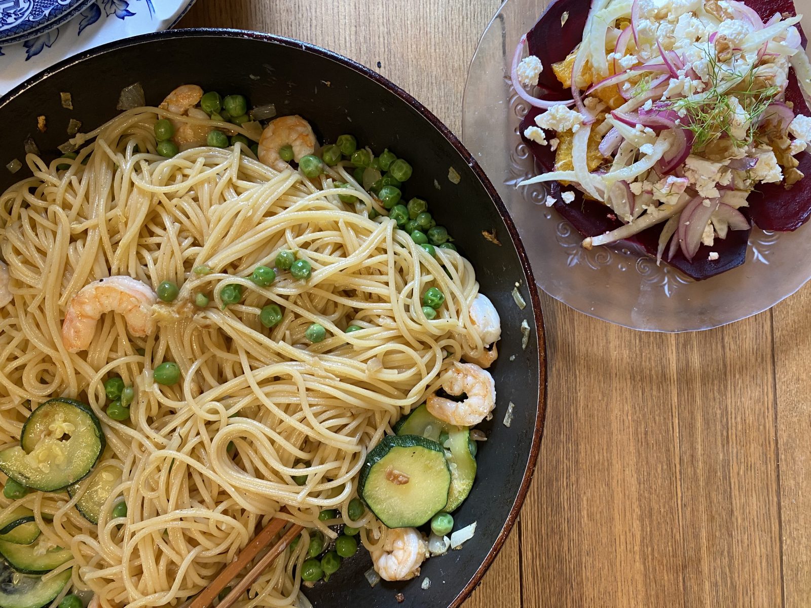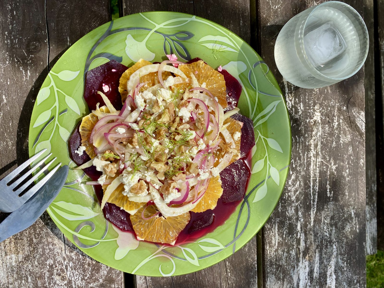 ビーツの鮮やかな赤、フェタチーズの白、オレンジの色が美しく、またビーツの甘さ、フェタの塩気、オレンジの酸味と甘みが合う。見た目も味も夏らしくとても気に入りました。