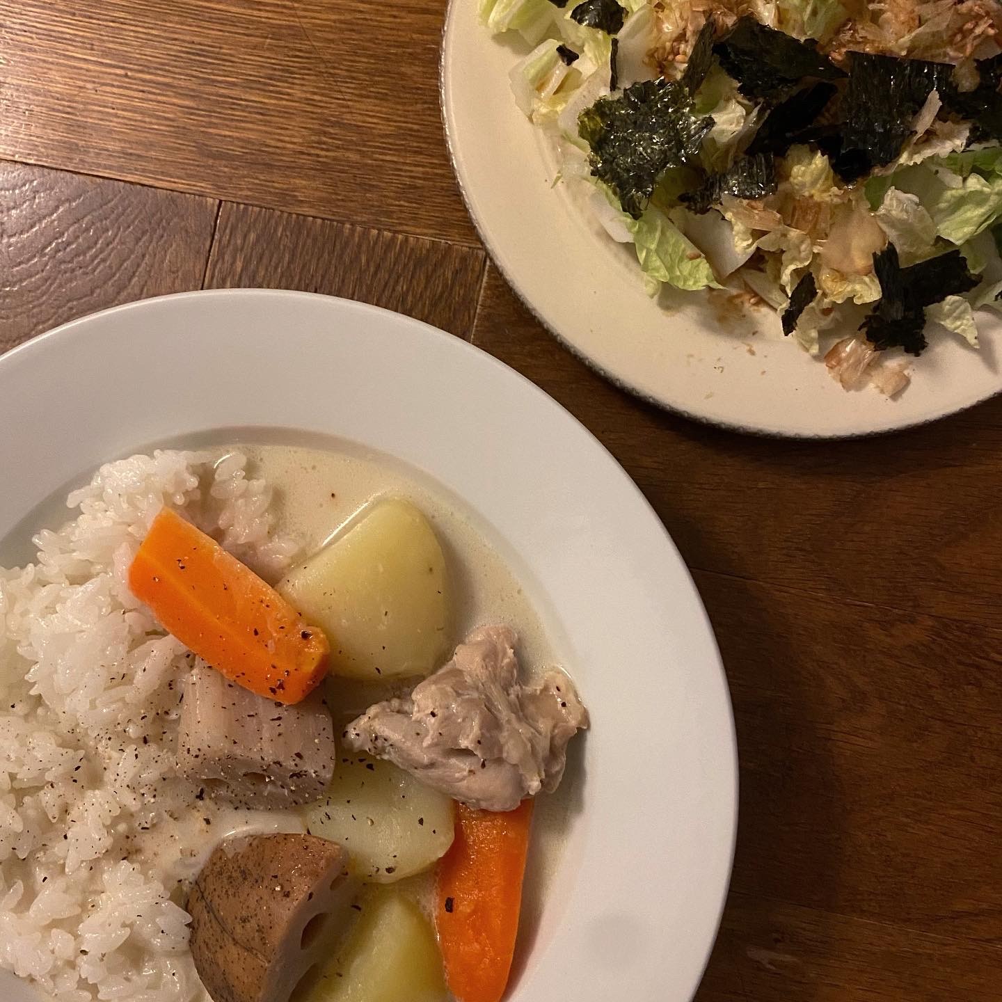 シチューごはん、白菜のサラダ(海苔、おかか、胡麻)