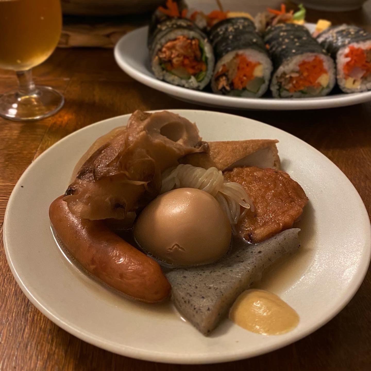 おでんDay2、アボカドの塩昆布のっけ、キムパ(買ってきた)、マカロニサラダ(昨日の)