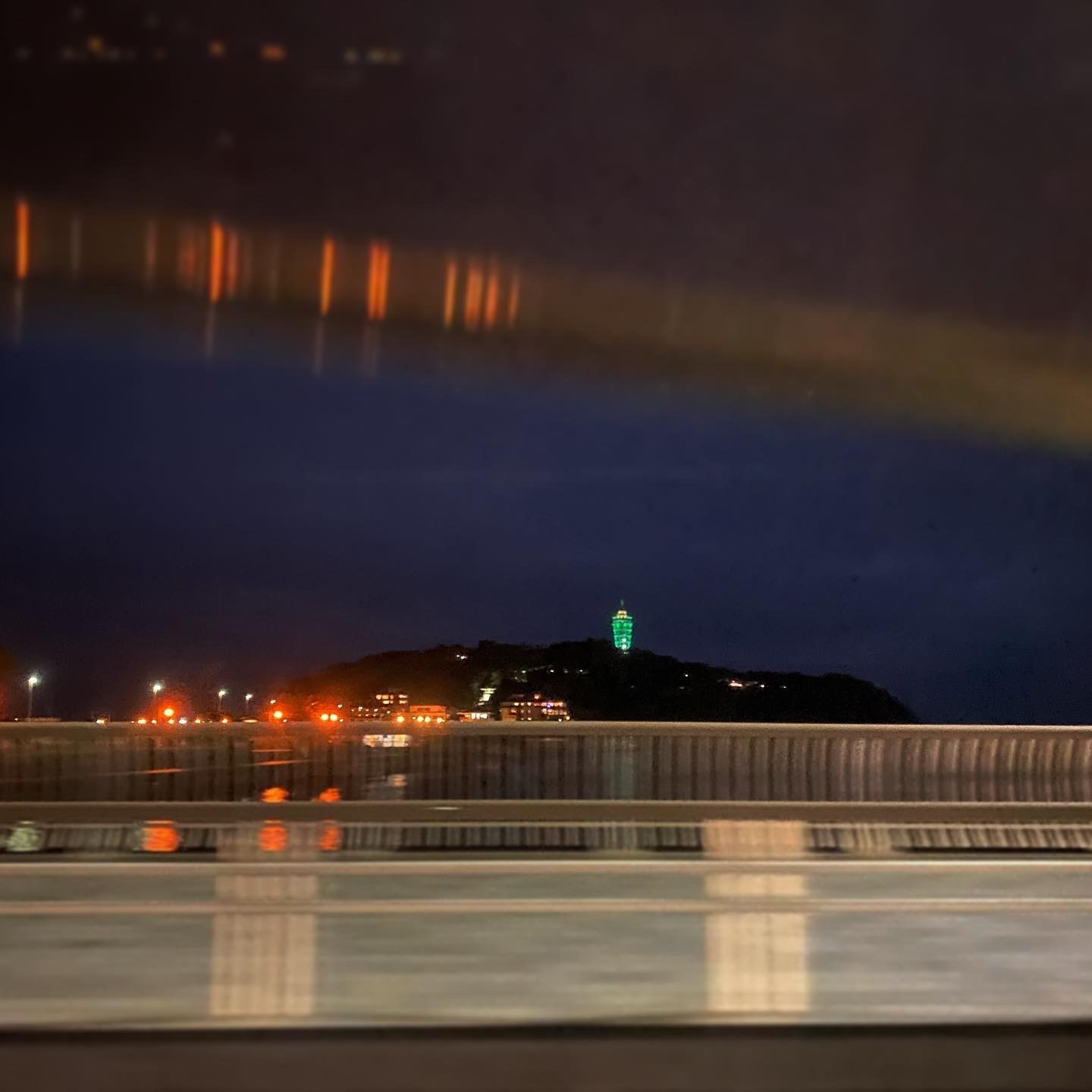 ライトアップされた江の島の灯台を横目に帰路へ。