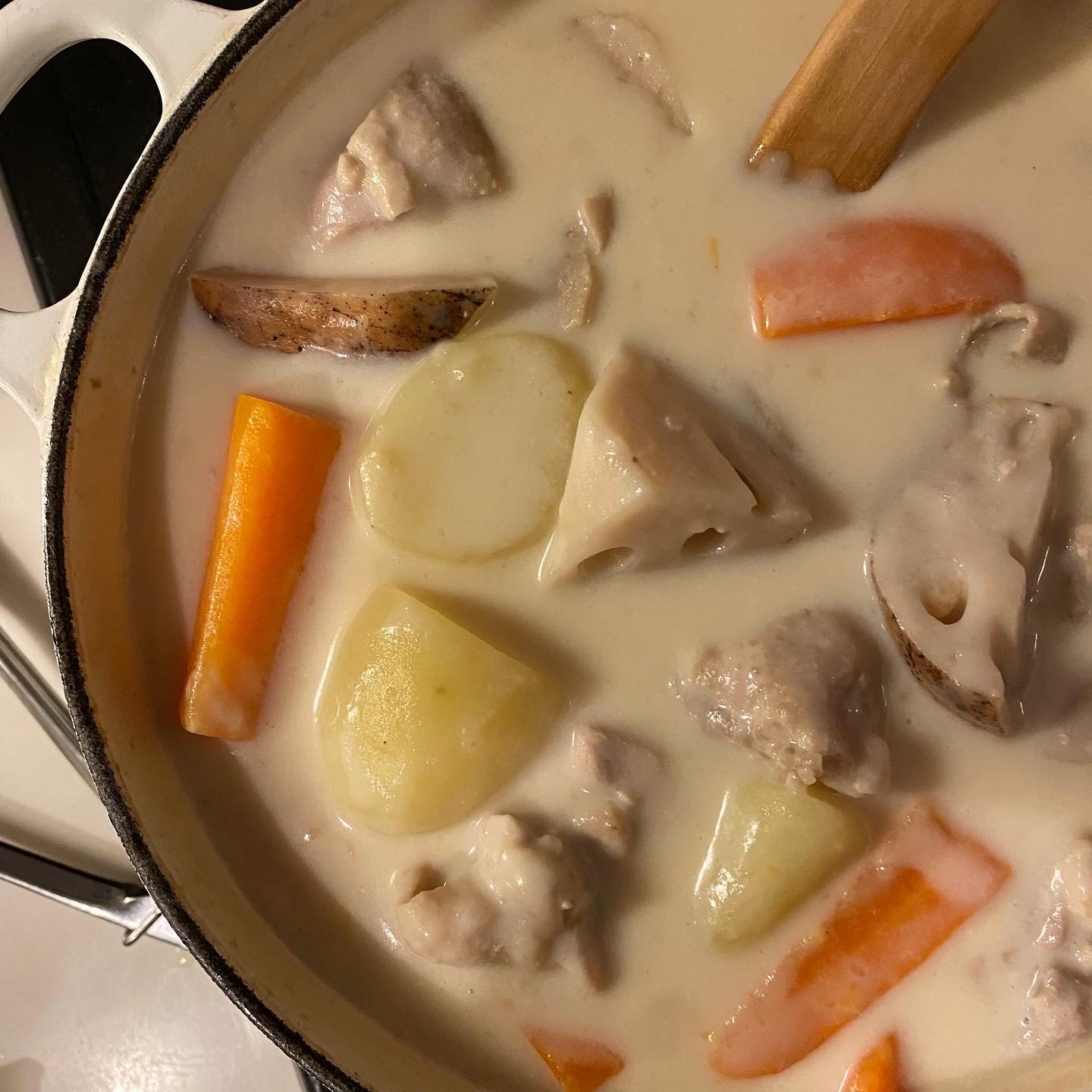 帰り道に美味しいパンをたくさん買ってきたので、今宵はシチュー。
