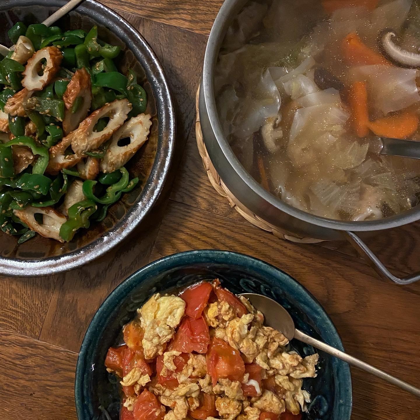 野菜たっぷりワンタンスープ、ちくわとピーマンの炒め物、トマトと卵の炒め物、白ごはん
