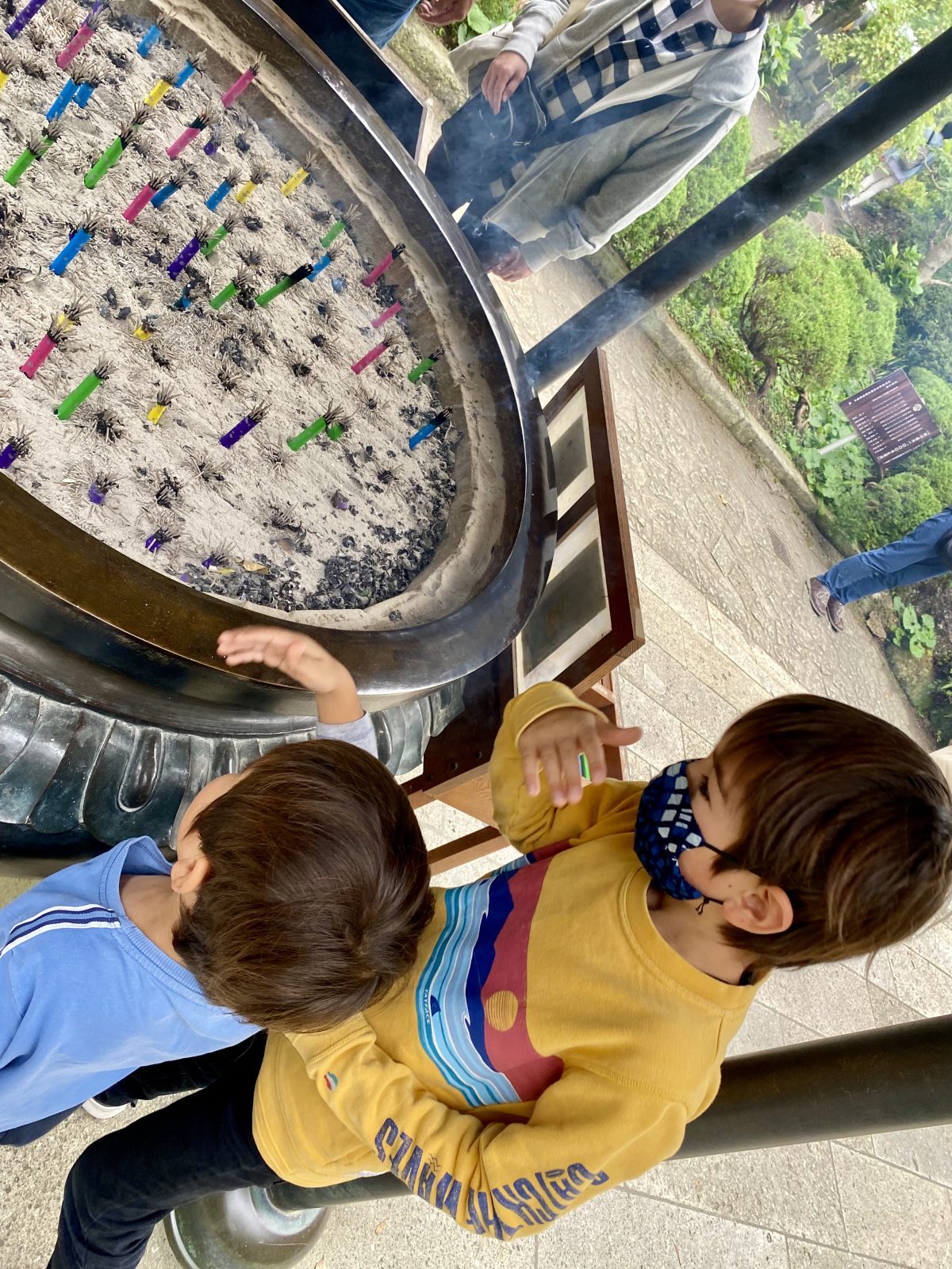 男児達は、お寺のお線香やら賽銭箱に「なにこれ?どうするの?やりたい!やりたい!」