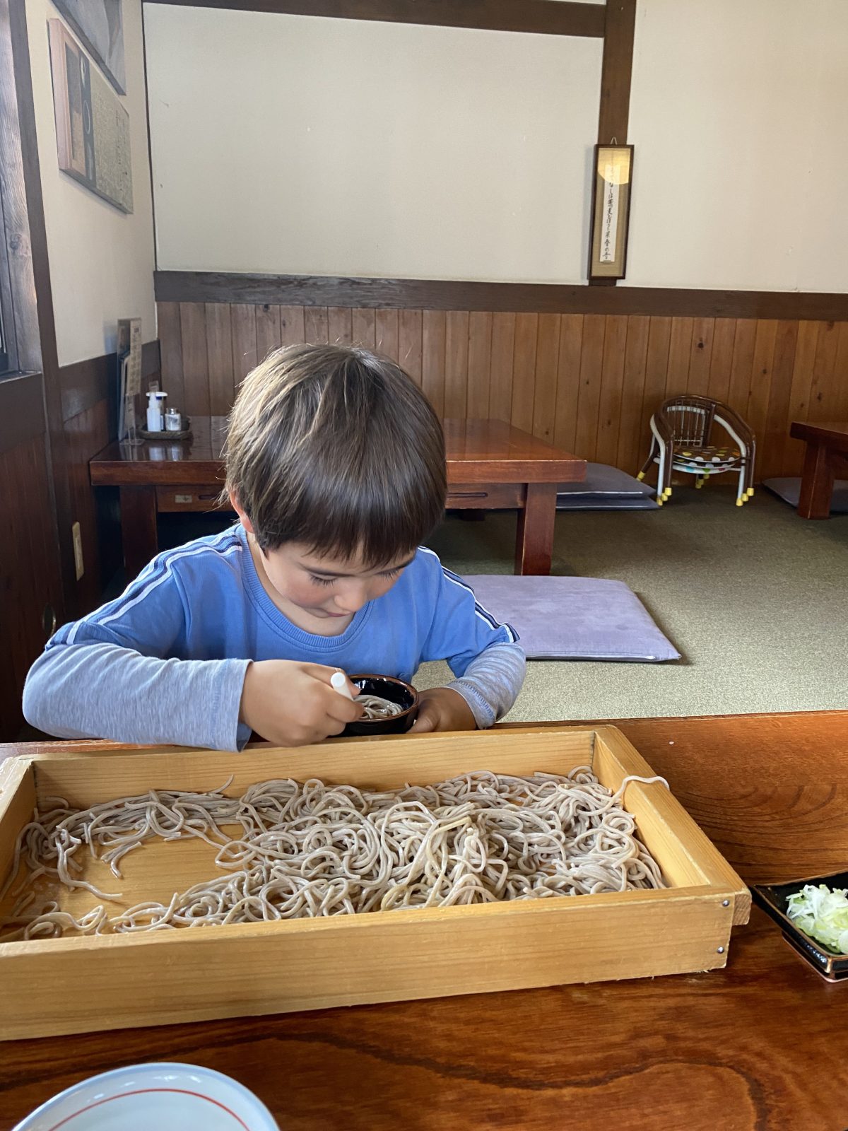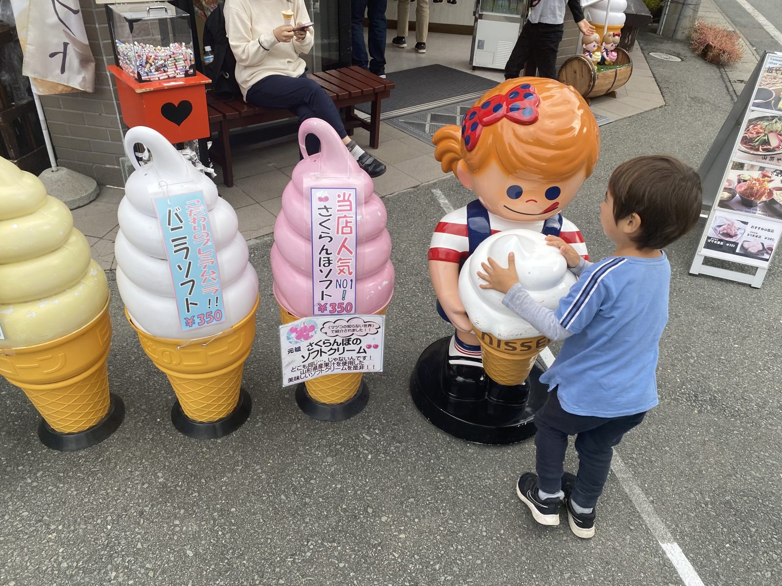 男児達、階段登らされたけどさくらんぼソフトクリームと蕎麦で大満足。