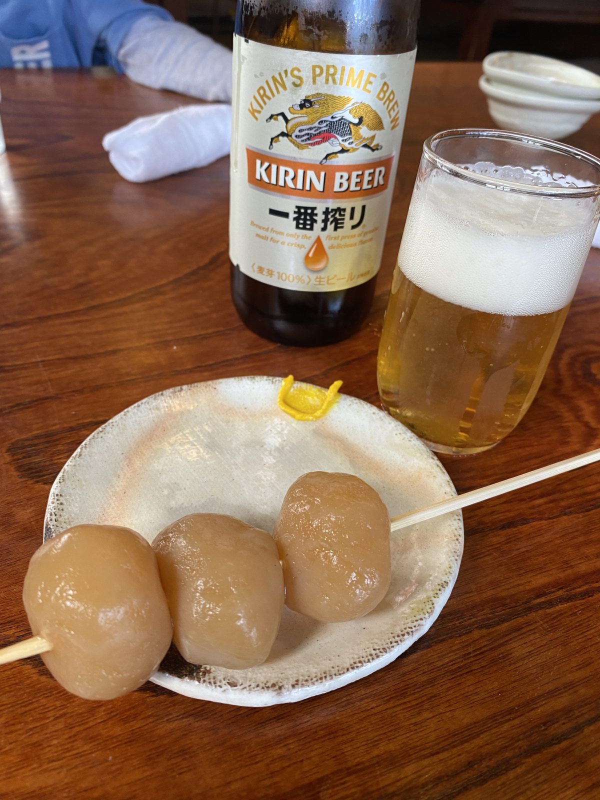 4歳児が板そばを平らげるわけがない。私はその板そばおこぼれをもらう作戦でビールと山形名物玉こんにゃく、芋煮を。